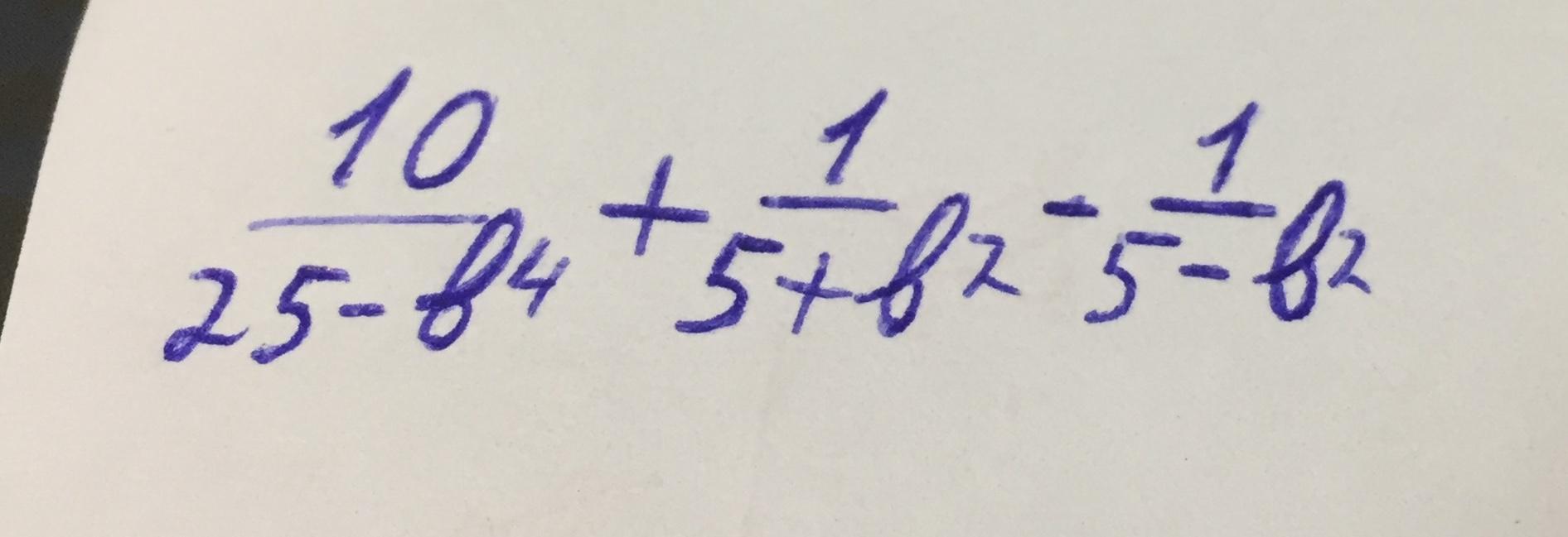 10/(25-b⁴) +1/(5+b²) -1/(5-b²)=10/((5-b²)(5+b²)) +(5-b²)/((5-b²)(5+b²)) -(5+b²)/((5-b²)(5+b²))=(10+5-b²-5-b²)/((5-b²)(5+b²))=(10-2b²)/((5-b²)(5+b²))=2(5-b²)/((5-b²)(5+b²))=2/(5+b²)