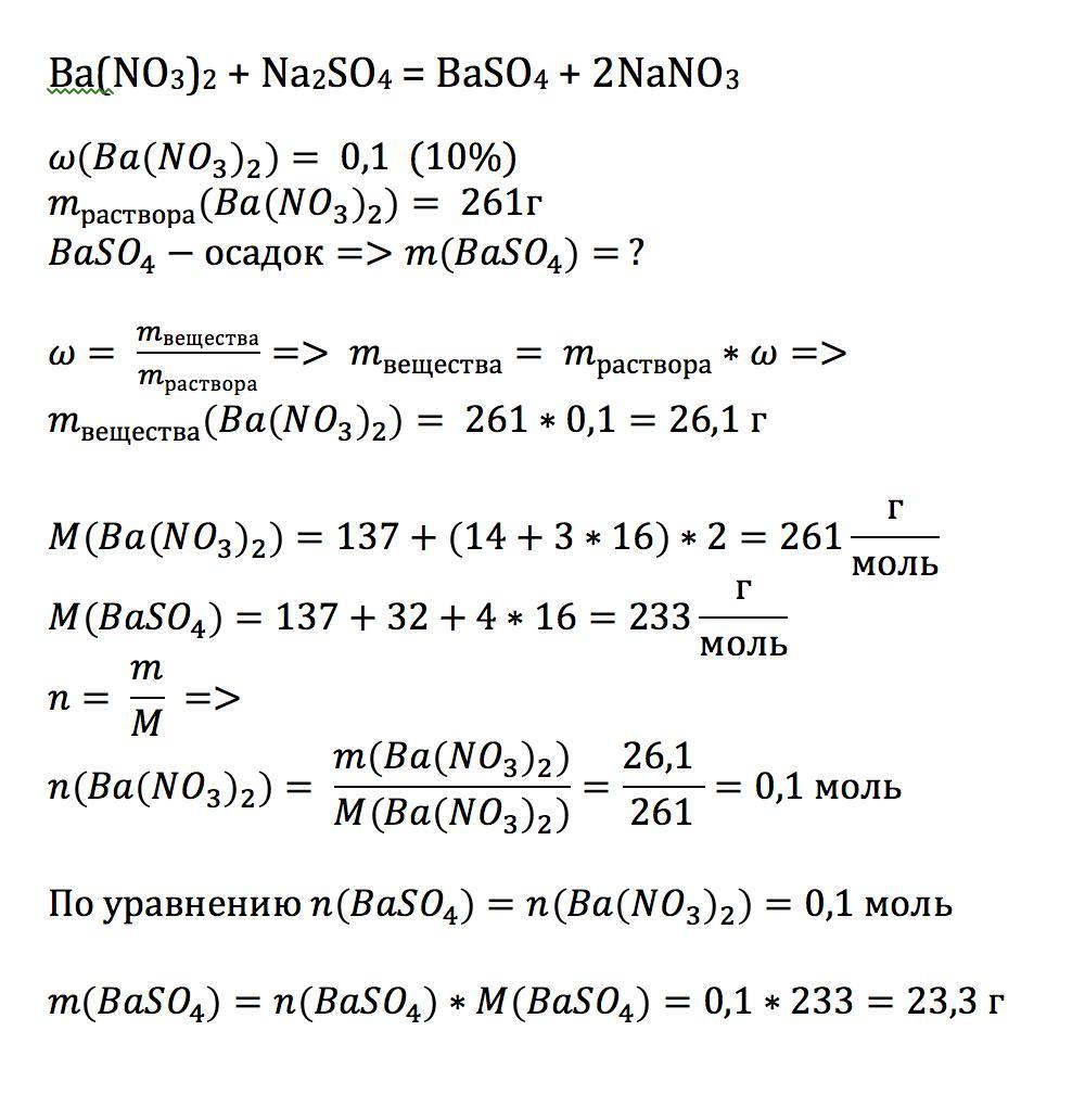 Какова масса осадка, полученного при взаимодействии 261 грамма 10% раствора нитрата бария с сульфатом натрия? С развернутым решением, пожалуйста