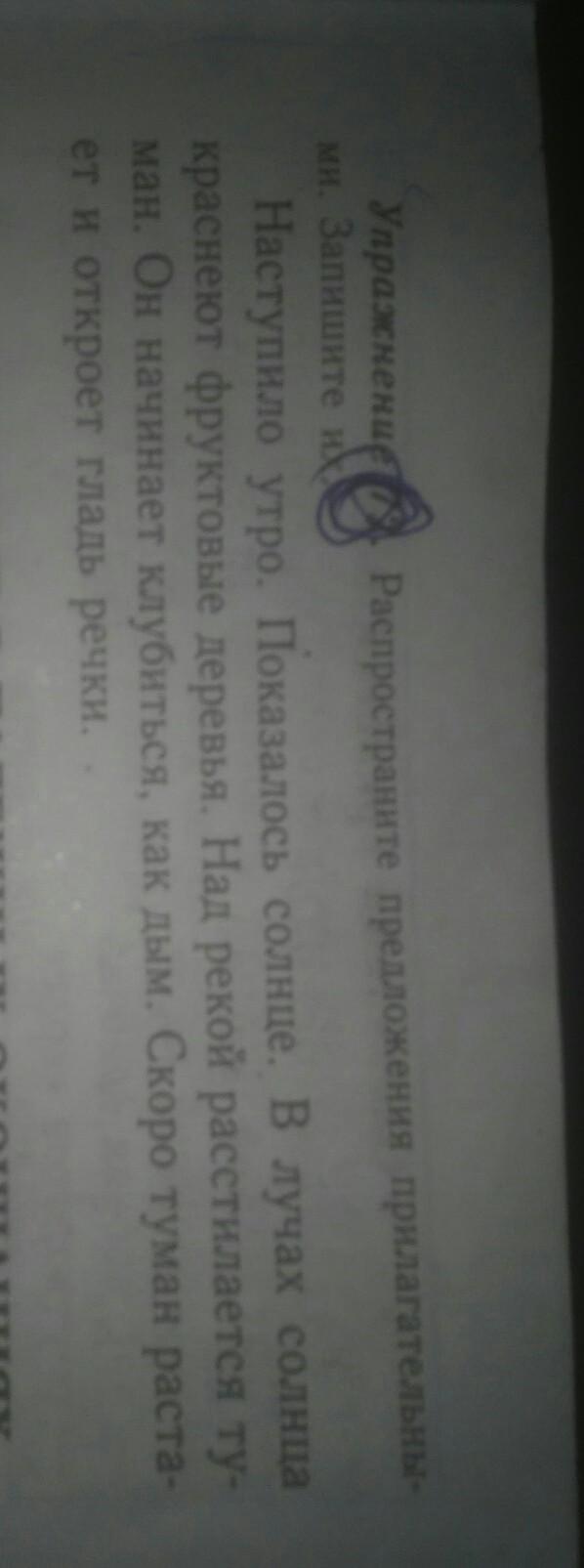 Наступило раннее утро. Показалось яркое солнце. В пляшущих лучах солнца краснеют фруктовые деревья. Над рекой расстилается плотный туман. Он начинает клубиться, как серый дым. Скоро туман растает и откроет гладь быстрой речки.