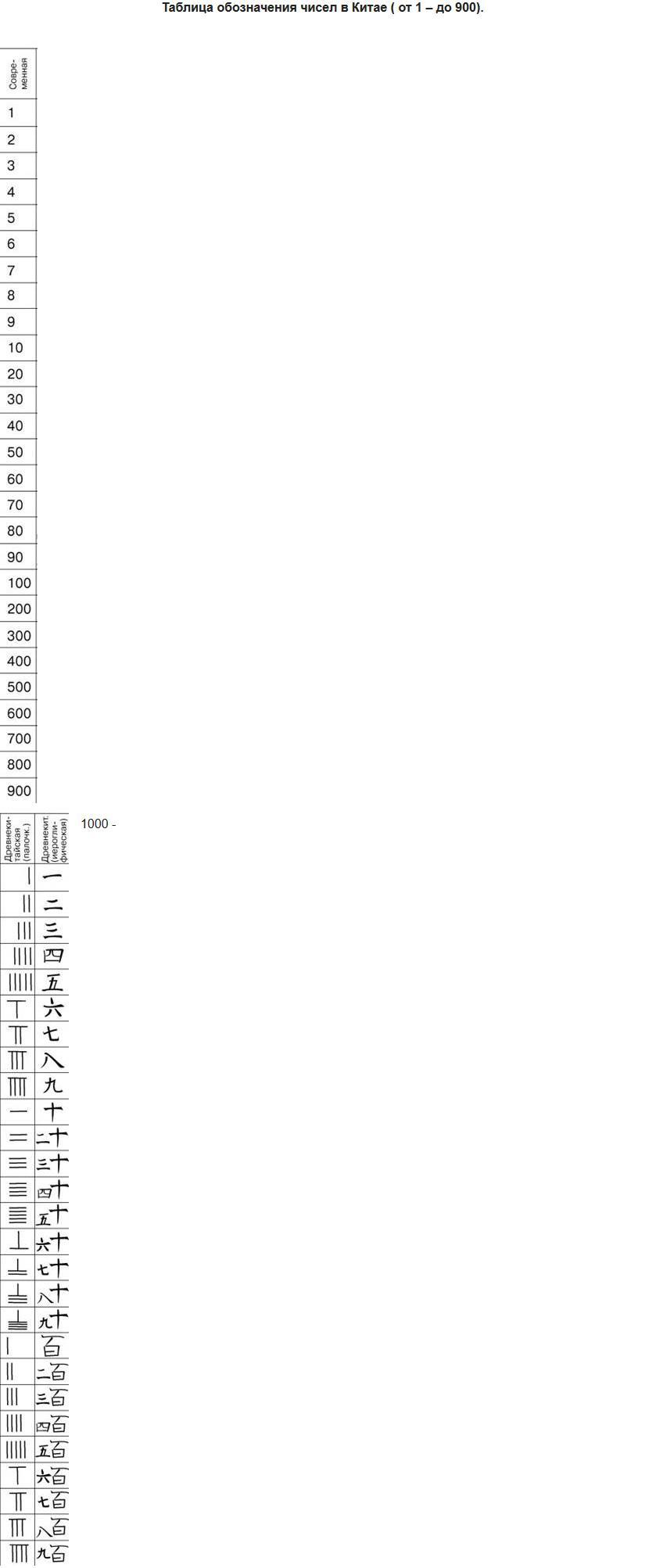 Таблица обозначения чисел в Китае ( от 1 – до 900).