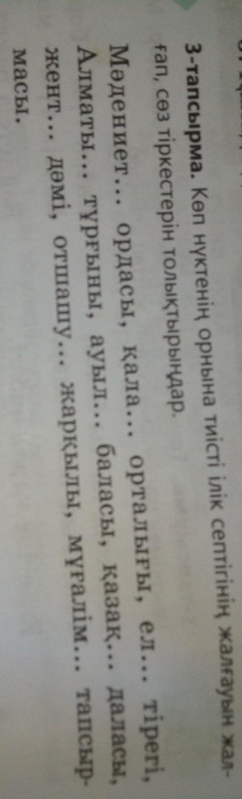 Мәдениеттің ордасы,қаланың орталығы,елдің тірегі,Алматының тұрғыны,ауылдың баласы,қазақтың даласы,женттің дәмі,отшашудың жарқылы,мұғалімнің тапсырмасы.