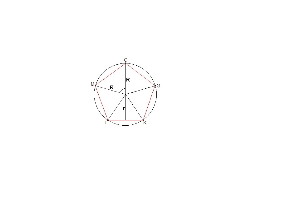 S = 5 · (1/2 R² · sin(360°/5)) = 5/2 R² · sin72°