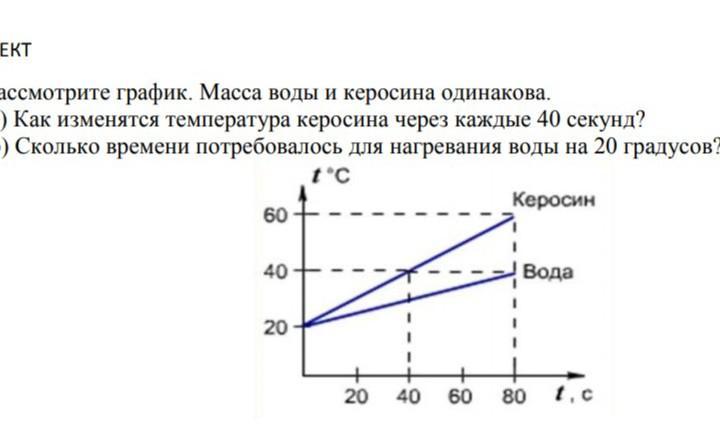 1) Температура керосина через каждые 40 секунд будет увеличиваться на 20 °С.