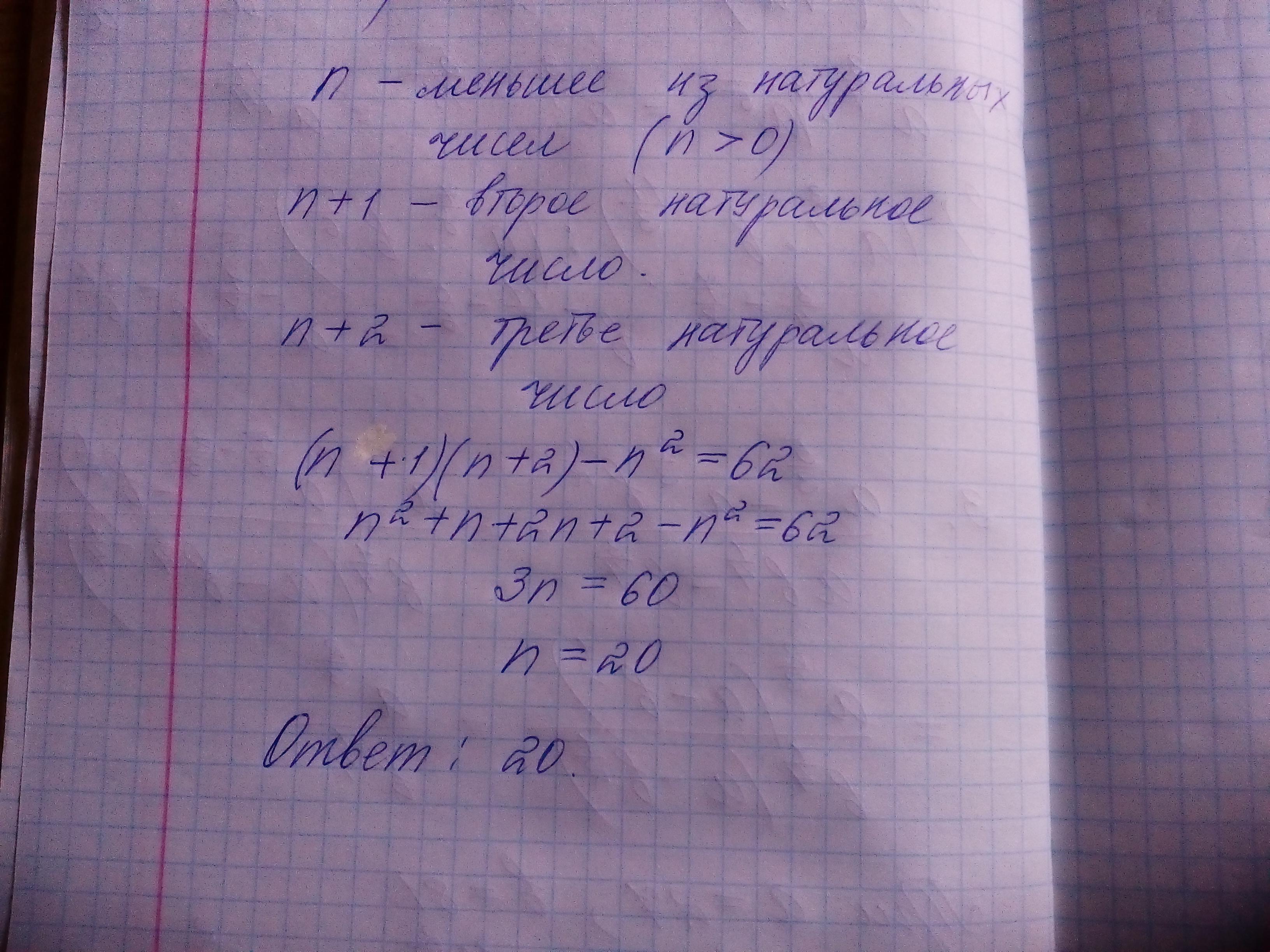 Наименьшее из трёх натуральных чисел, если известно, что квадрат меньшего из них на 62 меньше произведения двух других, равно...