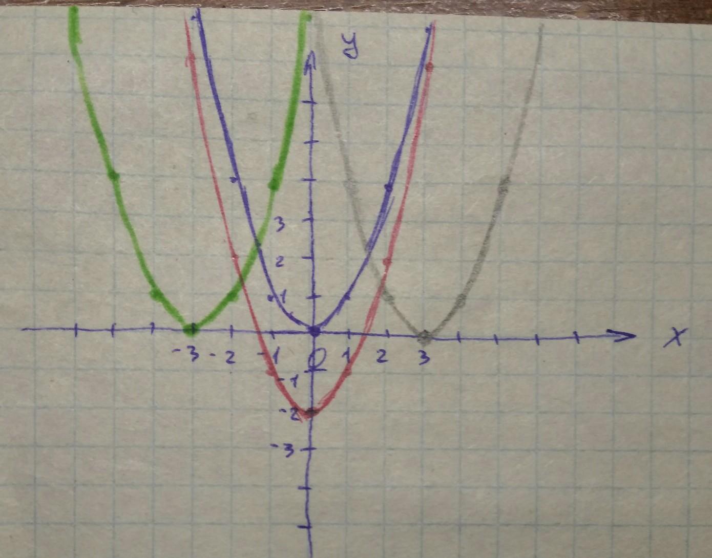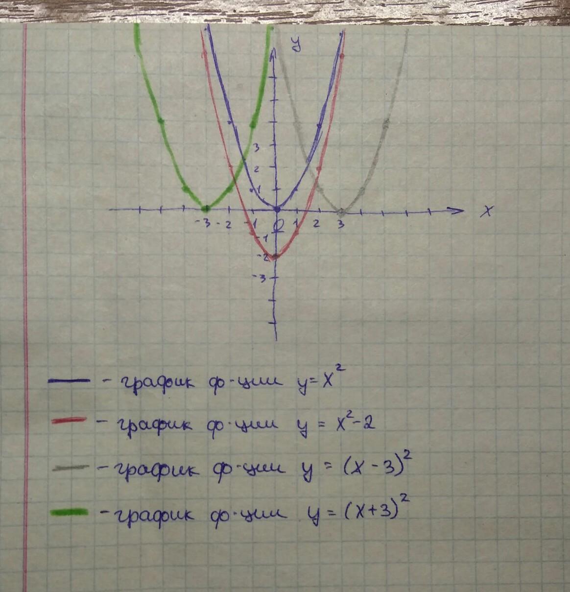 1) у = х² - 2; 2) у = х² + 2; 3) у = (х - 3)²; 4) у = (х + 3)².Пожалуйста Решите