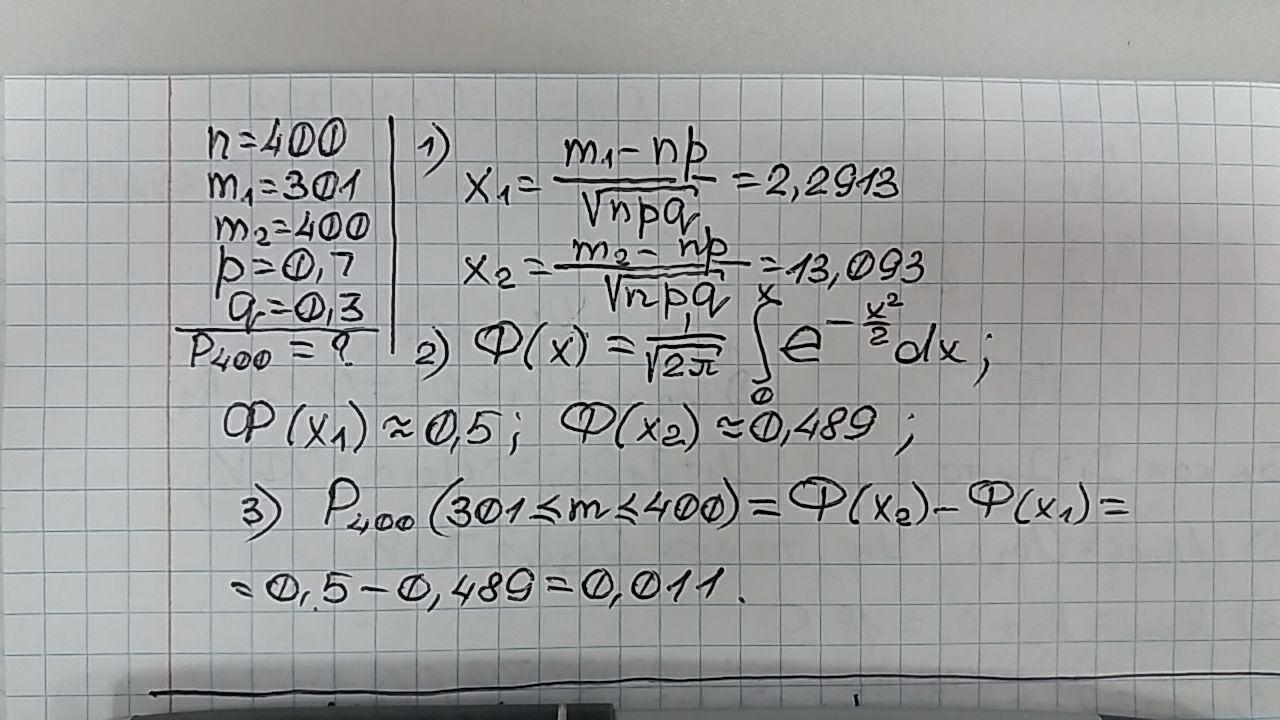 по интегральной формуле Лапласа, для количества попаданий между 301 и 400 (не более 100 промахов по условию).