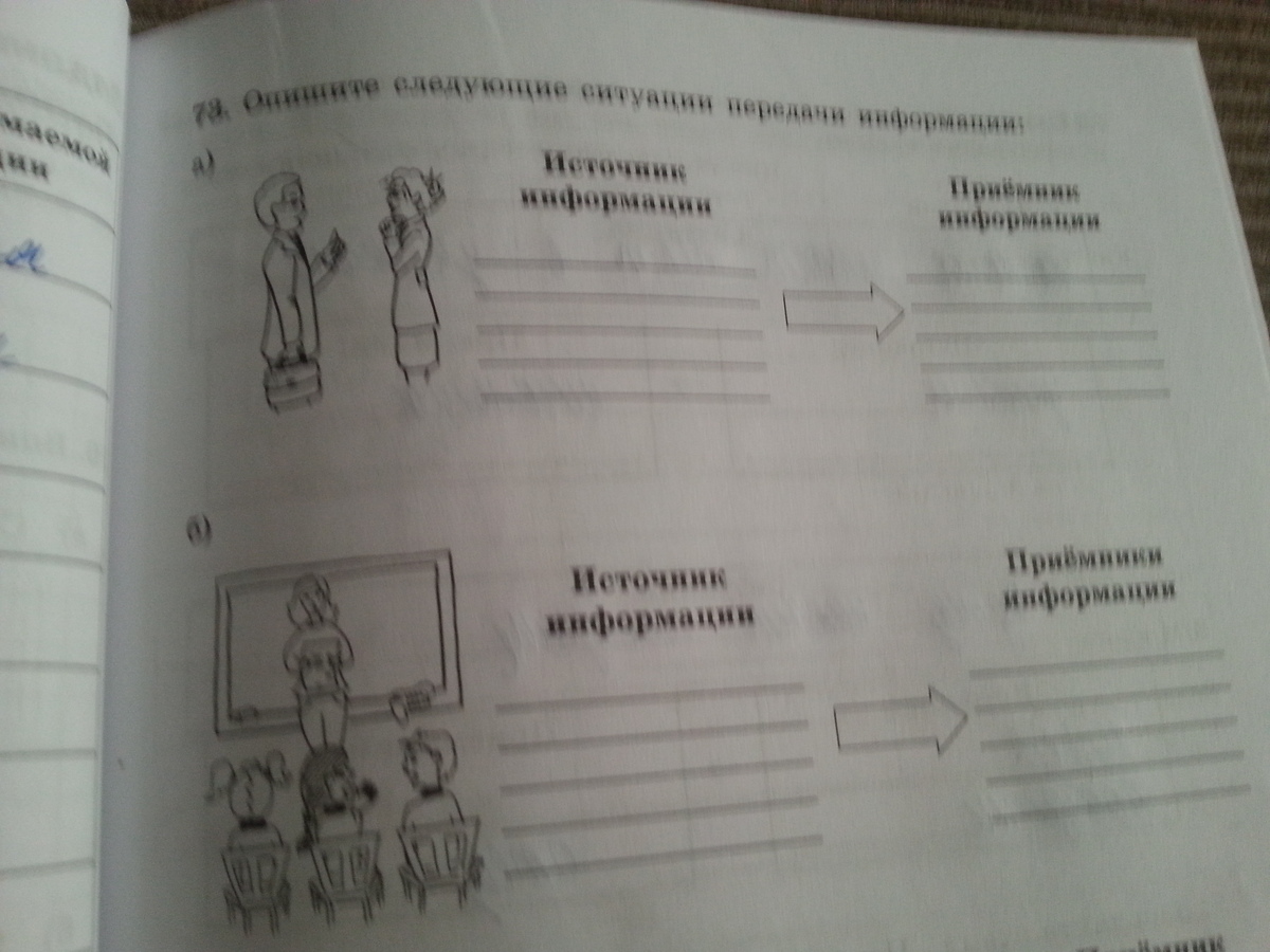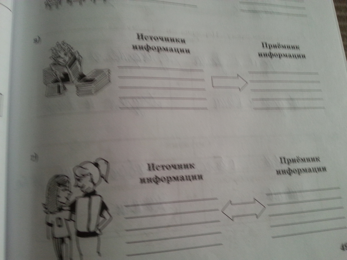 в)источник информацци-книги, приемник- человек(девочка),г)источник информации мама, приемник-дочь, или допустим источник-тренер, приемник-занимающийся, а)источник-доктор, приемник-больной, б)источник-учитель, приемник-учителя