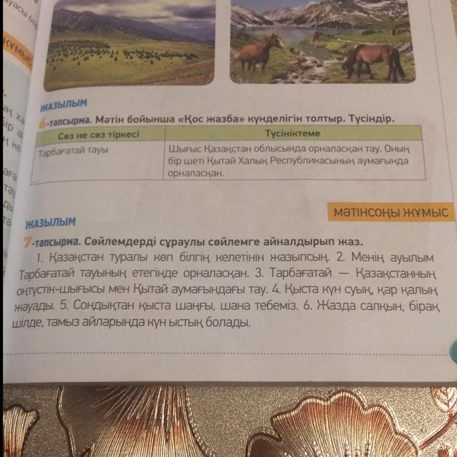 Менің ауылы Тарбағатай тауының етегінде орналасқан ау?.Тарбағатай-Қазақстанның оңтүстік-шығысы мен Қытай аумағындағы тау болар?Қыста күн суық,қар қалың жауатын шығар?.Сондықтан қыста шаңғы шана тебемізбе? Жазда салқын, бірақ шілде, тамыз айларында күн ыстық болады ма?