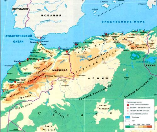 Если мы посмотрим на карту Атласских гор, которая дана ниже в приложении, то увидим, что они вытянуты с северо-востока на юго запад.А по шкале высот можно увидеть, что более пологий склон на южной стороне гор, а более крутой на севере.