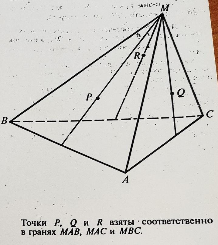 От этих точек проводим отрезки через точки P и Q до пересечения с боковыми рёбрами ВМ и СМ.