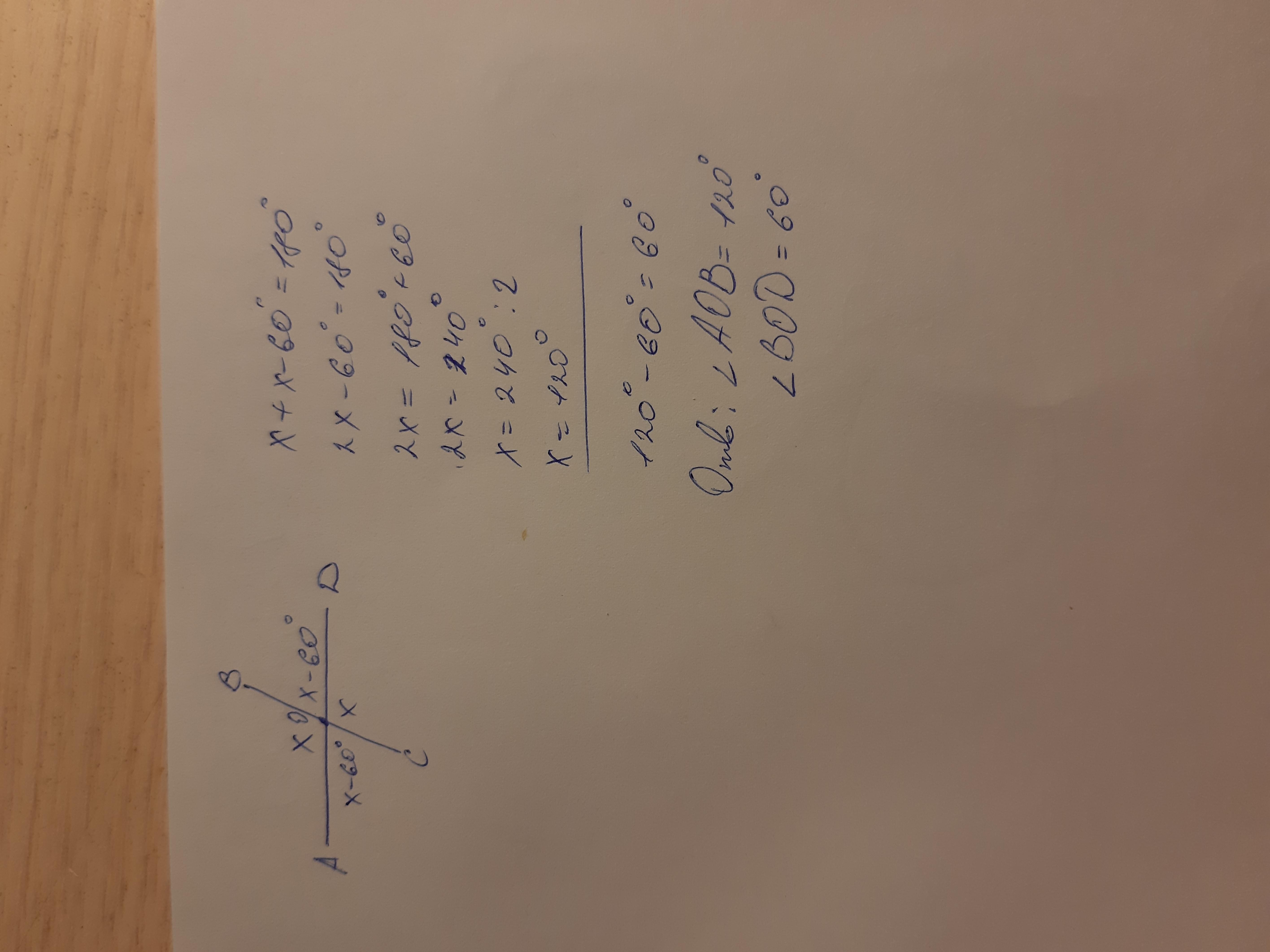 При пересечении двух прямых образовалось четыре угла меньше развернутого. Найдите эти углы, зная, что один из них на 60°меньше другого.
