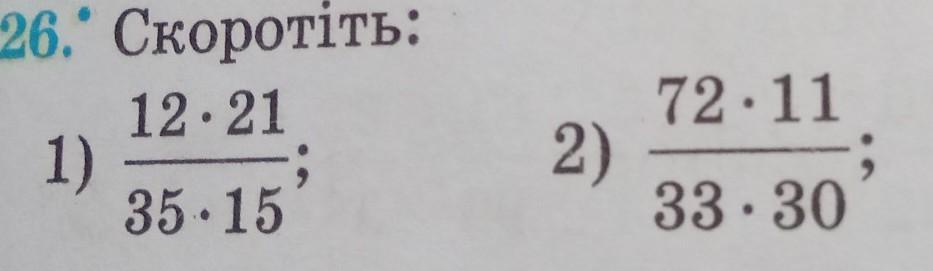 Нужно сокращать крест накрест . Например 11 и 33, ты сокращаешь на 11. Получается ответ 1 и 3. Дальше 72 и 30. Ты сокращаешь на 6. Получается 12 и 5 . Итого в числителе пишешь 12*1