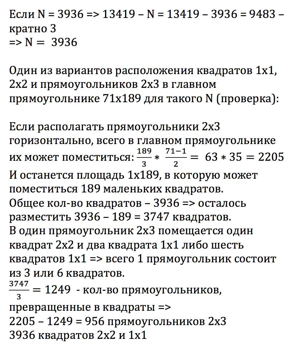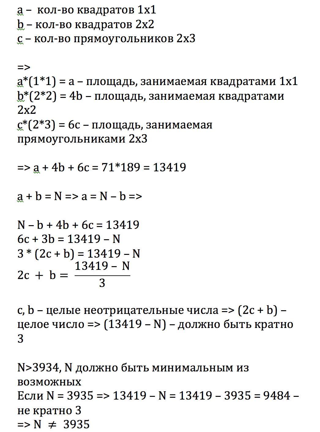 Прямоугольник 71× 189 разрезан на квадраты 1×1, 2×2 и прямоугольники 2×3. Суммарное количество квадратов разрезания оказалось равным N, где N>3934. Найдите наименьшее возможное значение N