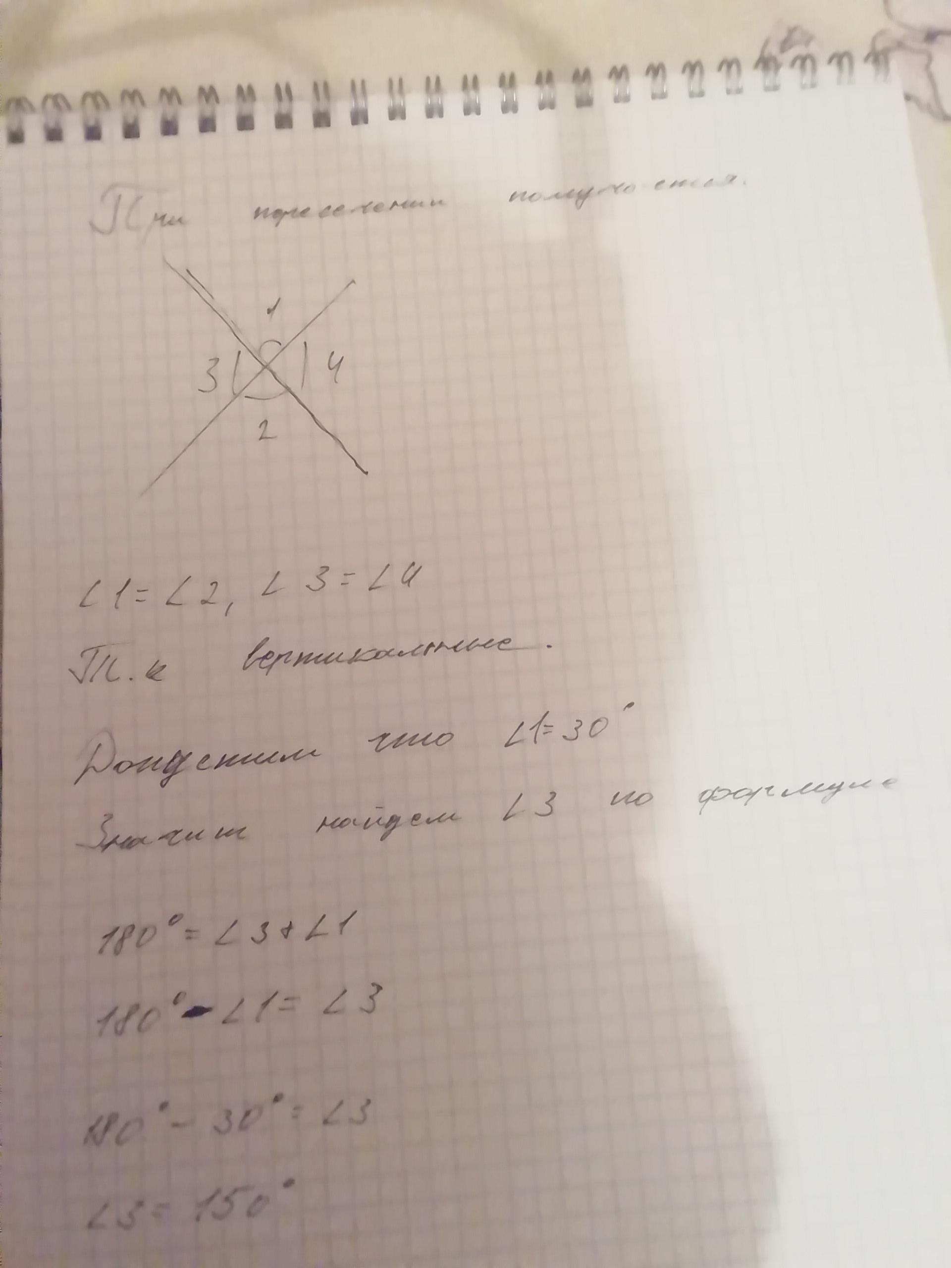 Так как при пересечении 2 прямых образуется 4 угла; угол равный 30 - вертикальный для противоположного угла => равен 30; сумма смежных углов равна 180; 180-30=150