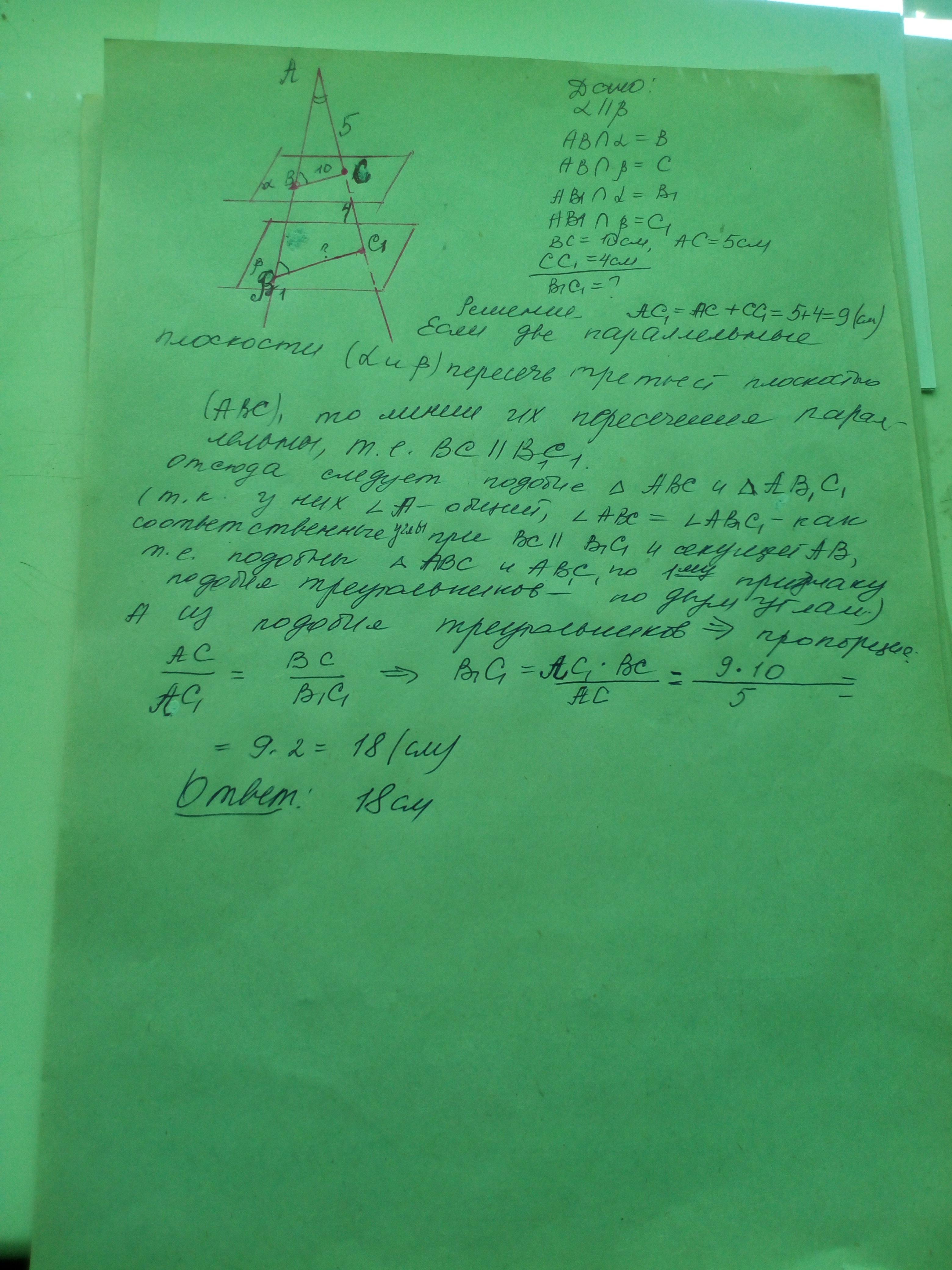 Через точку А, расположенную по одну сторону от параллельных плоскостей α и β, проведены две прямые, которые пересекают плоскость а в точках В и С, а плоскость В в точках В1 и С, соответственно. Найдите длину отрезка В1С1, если ВС= 10 см, AС= 5 см, СС1 = 4 см.