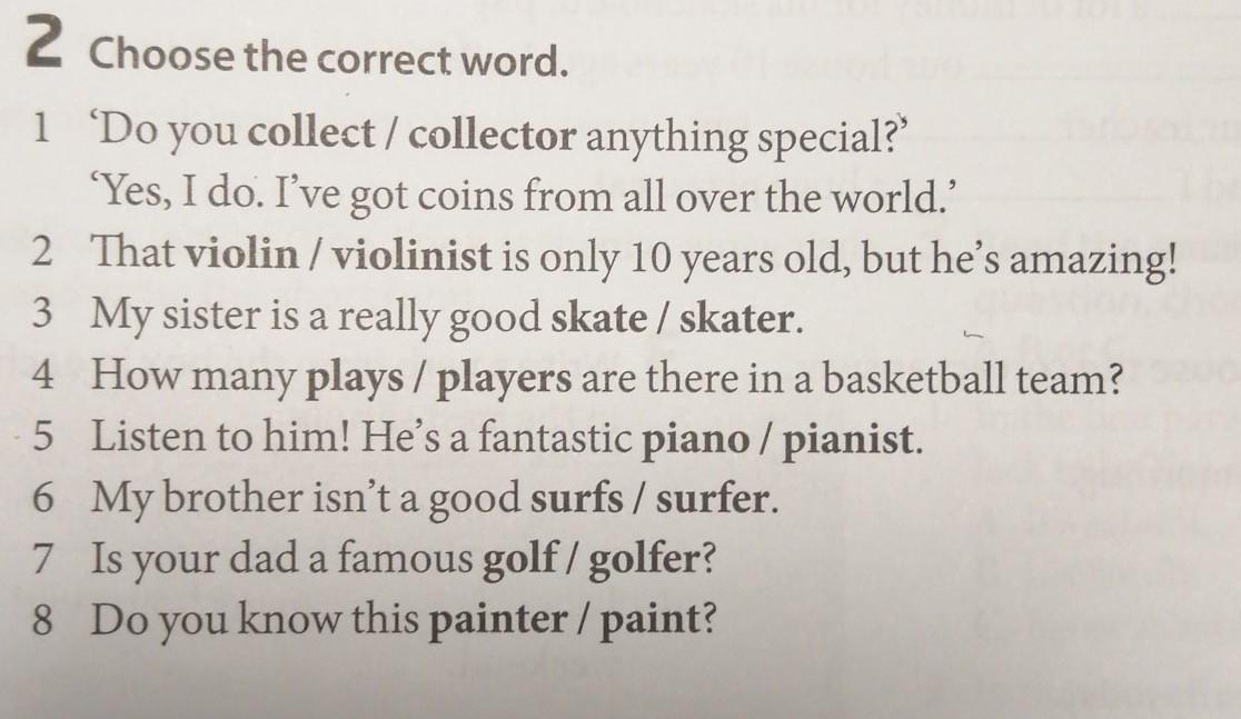 1 collect, 2 violinist, 3 skater, 4 players, 5 pianist, 6 surfer, 7 golfer, 8 painter