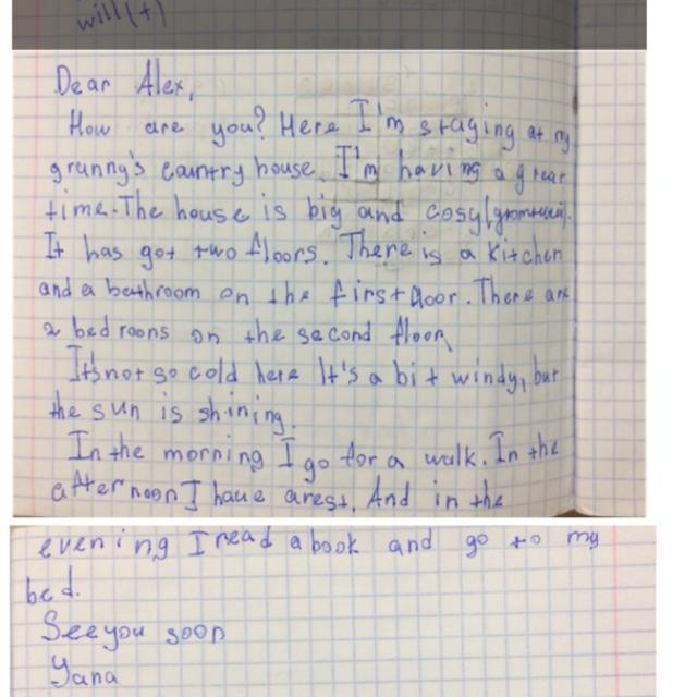How are you?Here I’m staying at my grunny’s country house.I’m having a great time.The house is big and cosy.It has got one floors.There is a kitchen and a bathroom.