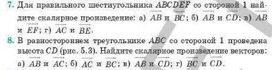 7. Для правильного шестиугольника ABCDEF со стороной 1 найдите скалярное произведение а) АВ и ВС б) АВ и СD в) АВ и EF г) АС и ВЕ