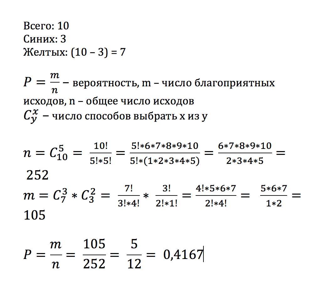 Мама купила ребенку 10 надувных шариков, 3 из которых синего цвета, остальные желтого. ребенок берет на удачу 5 шариков и надувает их. какова вероятность того, что среди надутых щариков 3 желтого цвета?