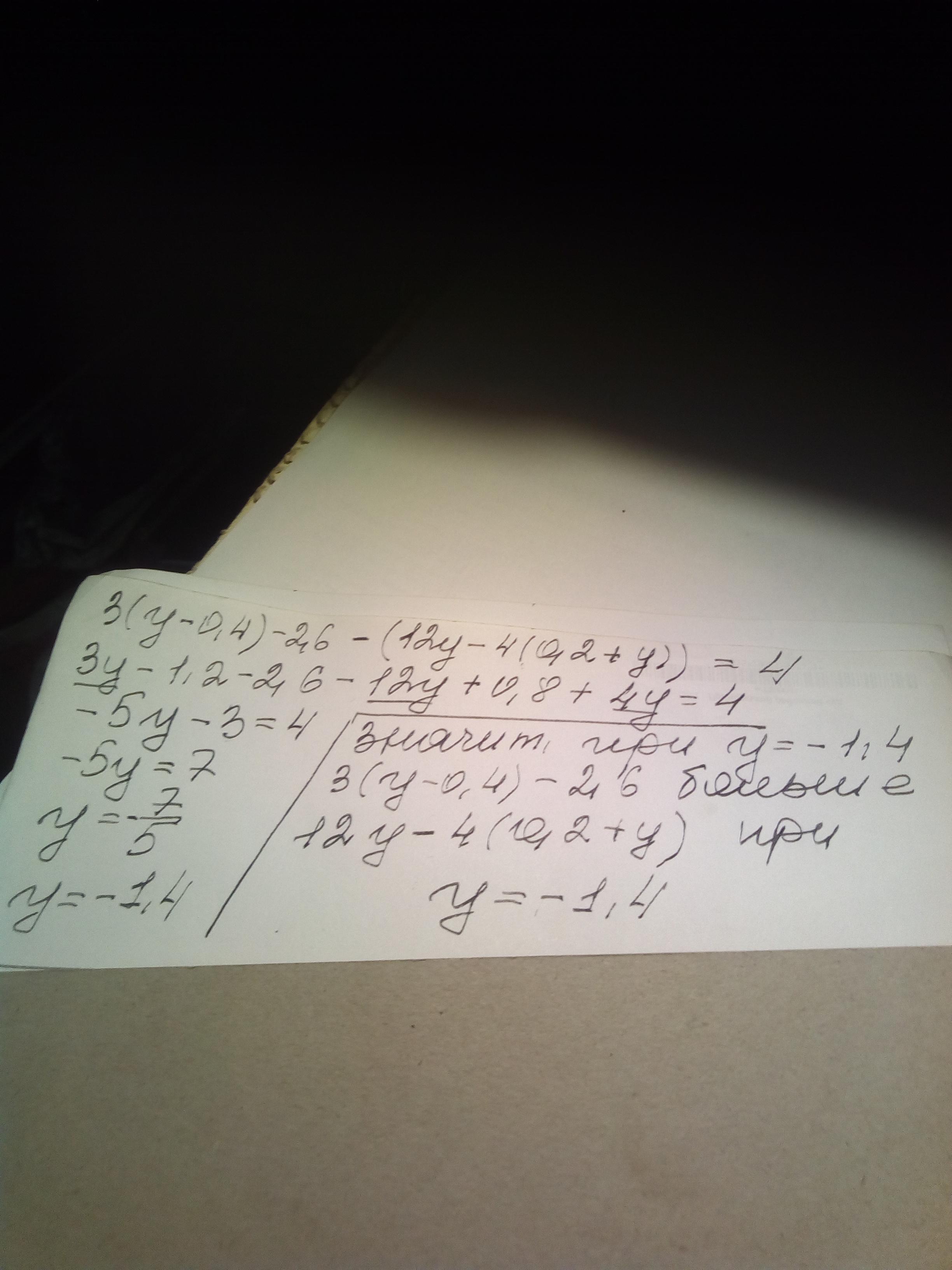 3(у – 0,4) – 2,6-(12y – 4(0,2 + y))=4