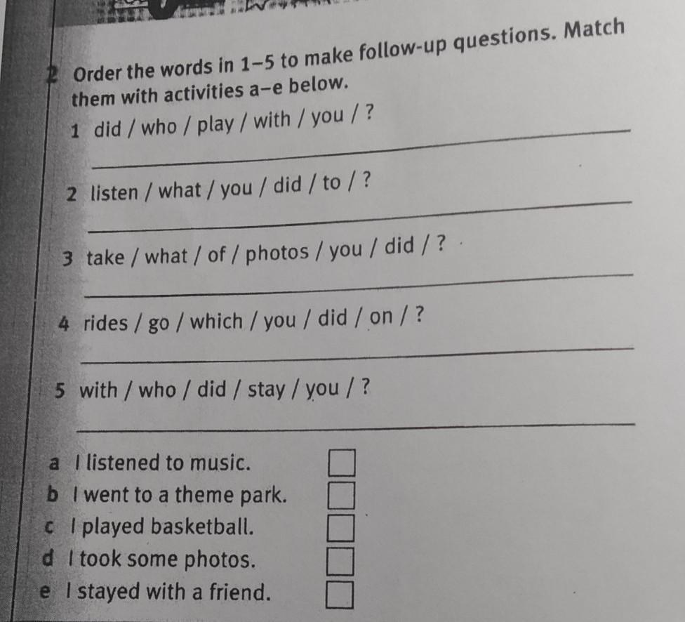 Order the words in 1-5 to make follow-up questions. Match