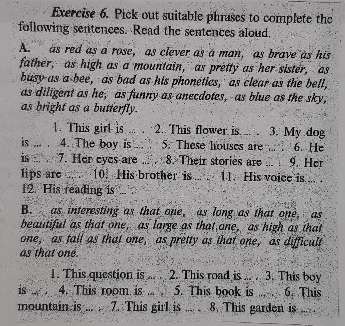 A. 1. This girl is as pretty as her sister 2. This flower is as bright as a butterfly 3. My dog as clever as a man 4. The boy is as brave as his father 5. These houses are as high as a mountain 6. Heavy is as busy as a bee 7. Her eyes are as blue as the sky 8. Their stories are as funny as anecdotes 9. Her lips are as red as a rose 10. His brother is as diligent as he 11. His voice is as clear as the bell, 12. His reading is as bad as his phonetics