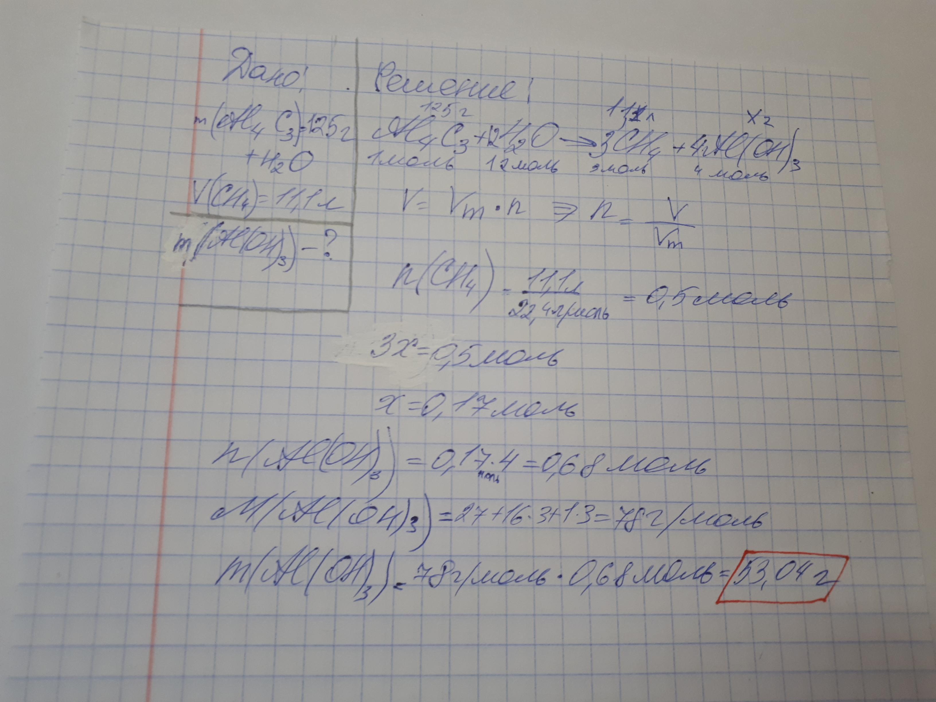 При взаимодействии карбида алюминия массой 125 г с водой, образовался газ объемом 11.1 л и Х соединение. Найдите массу Х соединения.