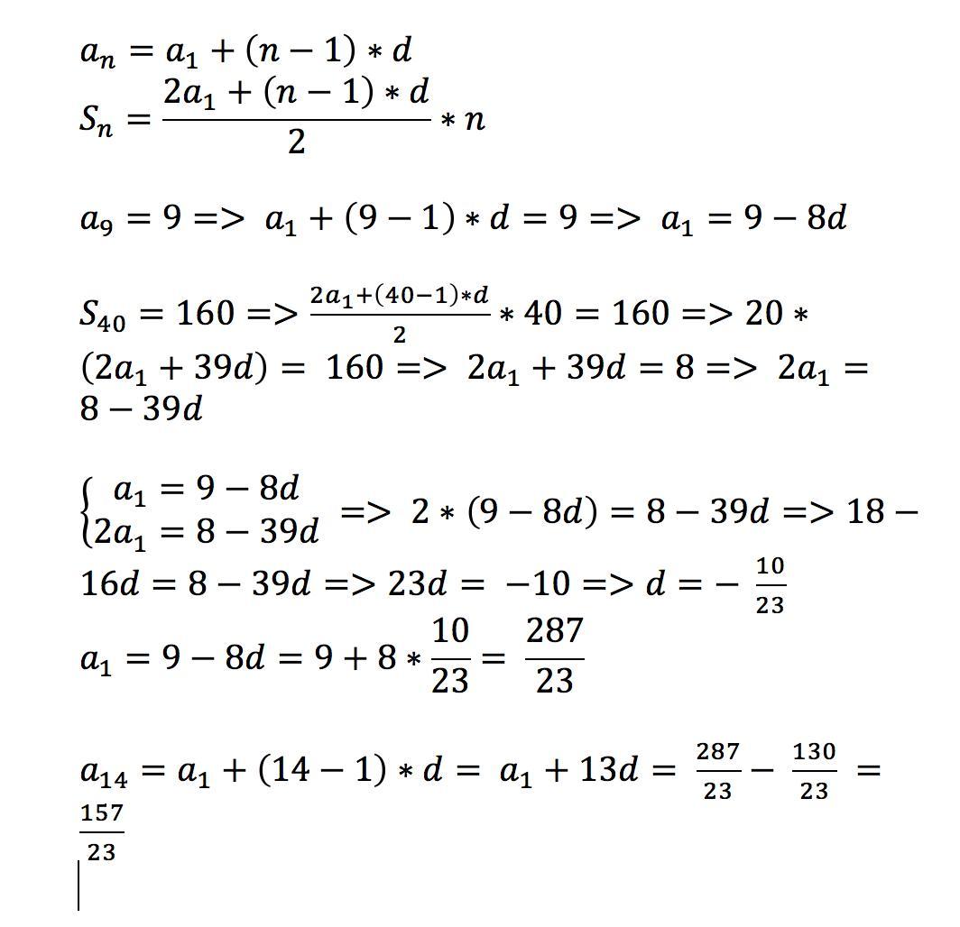 Сумма сорока первых членов арифметической прогрессии равна 160, а её девятый член равен 9. Найти четырнадцатый член этой прогрессии.