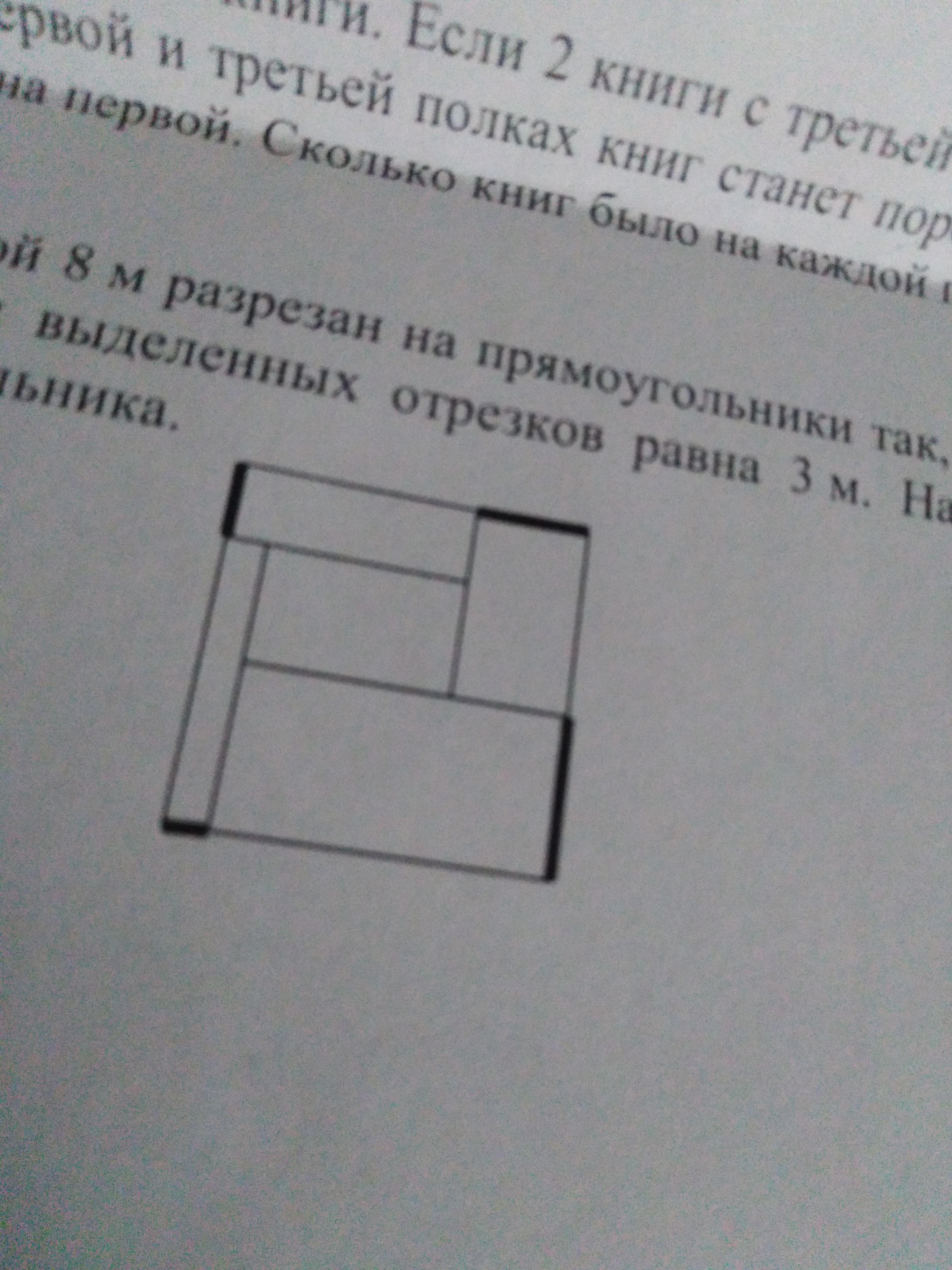 Квадрат со стороной 8 м разреза ли на прямоугольник так, как показано на рисунке. Сумма длин выделенных отрезков равна 3 метра. Найдите периметр внутреннего прямоугольник.