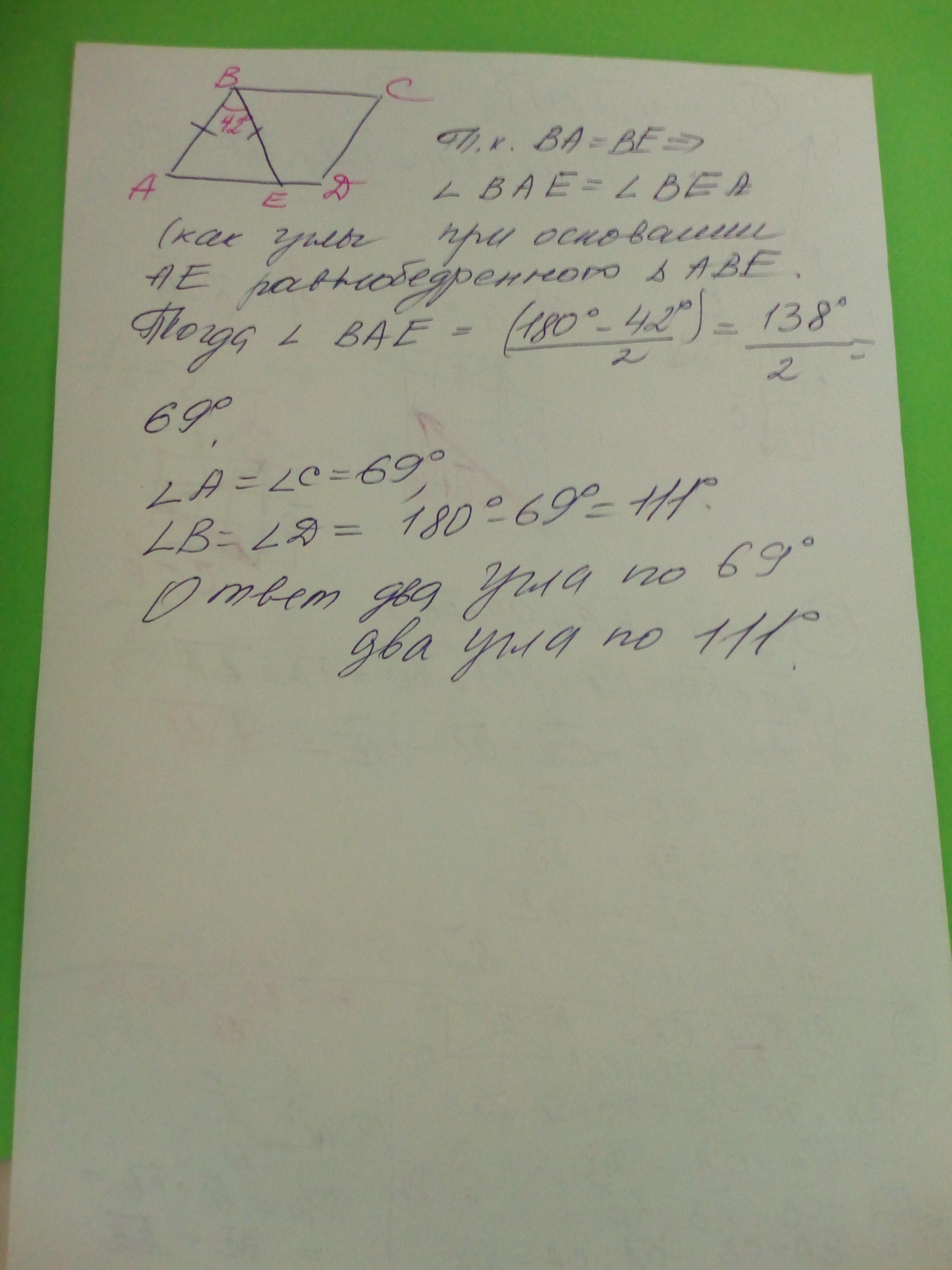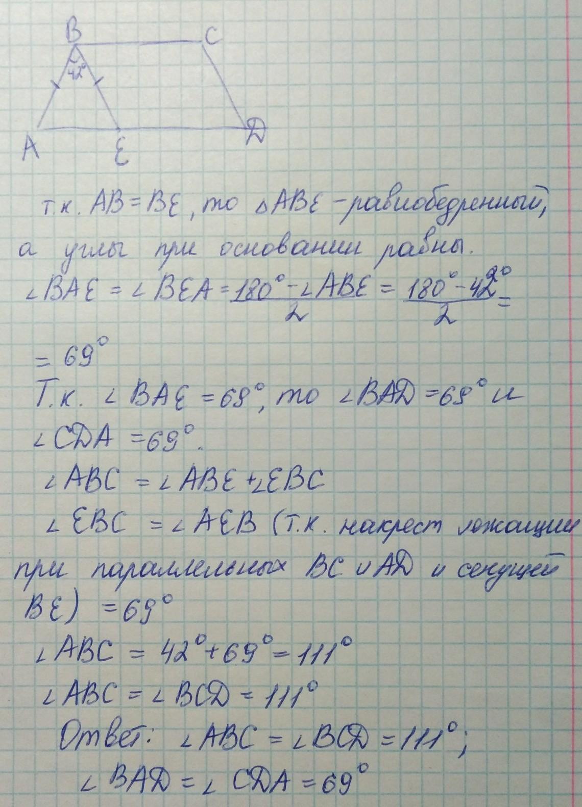 В параллелограмме ABCD точка Е лежит на стороне AD при чём АВ равно ВЕ, ∠АВЕ равен 42°. Найти углы параллелограмма.