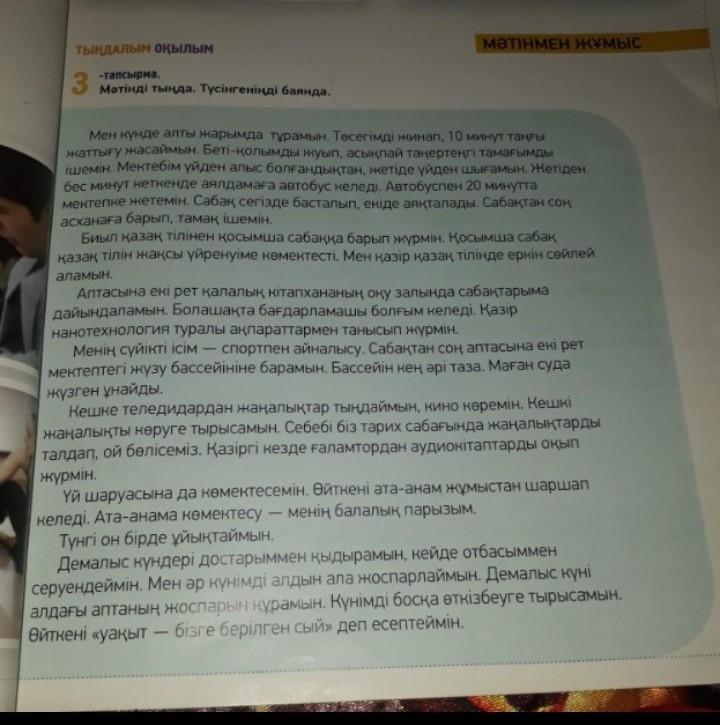 Мен кунде алты жарымда турамын.Тосегемди жинап,он(10) минуттангы жаттыгу жасаймын мен танертенги тамак ишемин.Автобуспен жиырма(20) минутта мектепте жетемин мен содан кейін сабақ басталады.Биыл казак тилинен косымша сабакка барып журмин.Мен казир казак тилинде еркин сойлей алмамын.Менин суйикти исим - спортпен айналысу.Сабактан сон аптасына еки рет мектептеги жузу бассейине барамын.Кешке теледидардан жаналыктар тындаймын,кино коремин.Уй шаруасына да комектесемин.Демалыс куни алдагы аптанын жоспарын курамын.