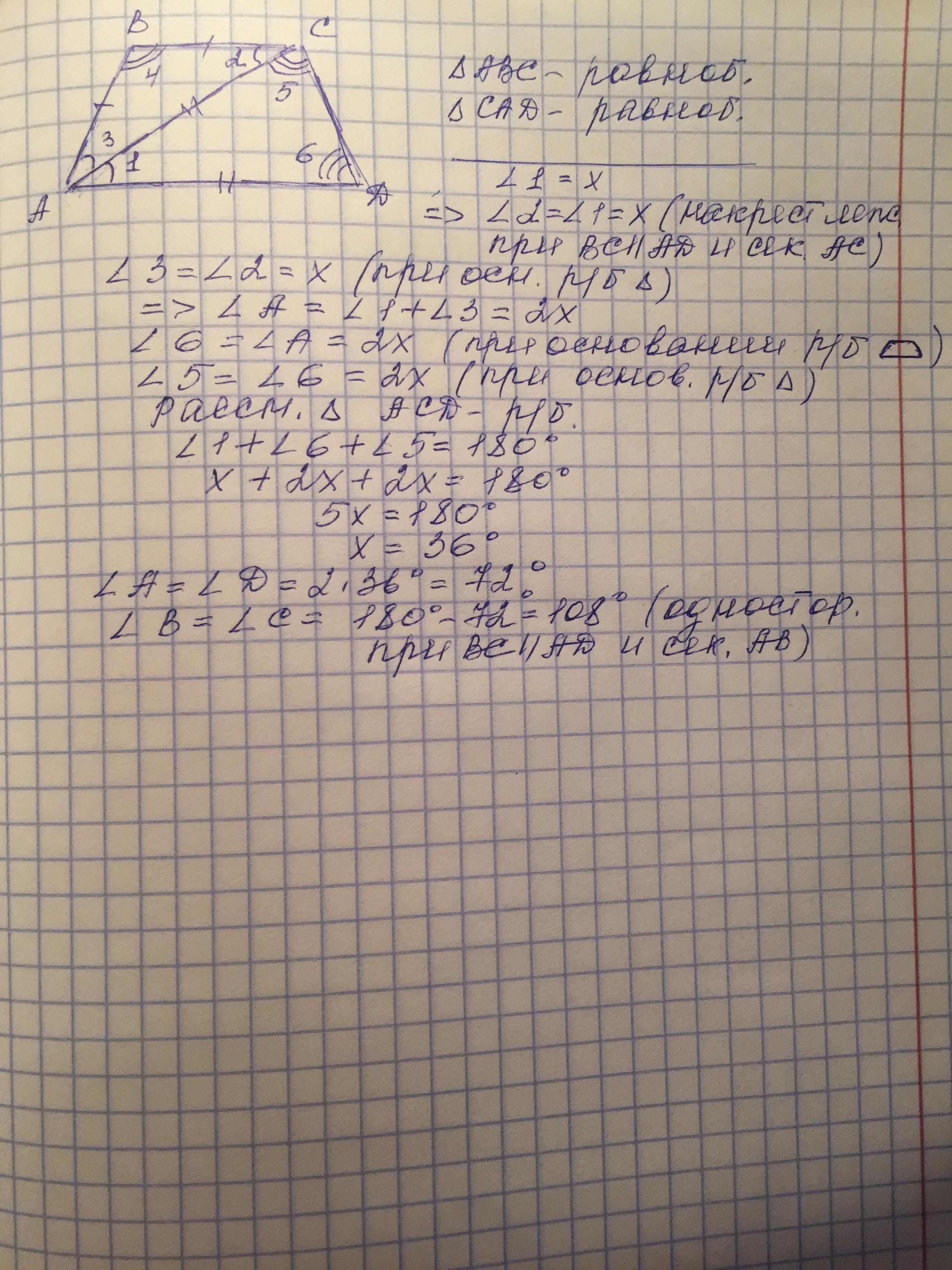 Диагональ равнобедренной трапеции делит её на два равнобедренных треугольника. Найдите углы трапеции.