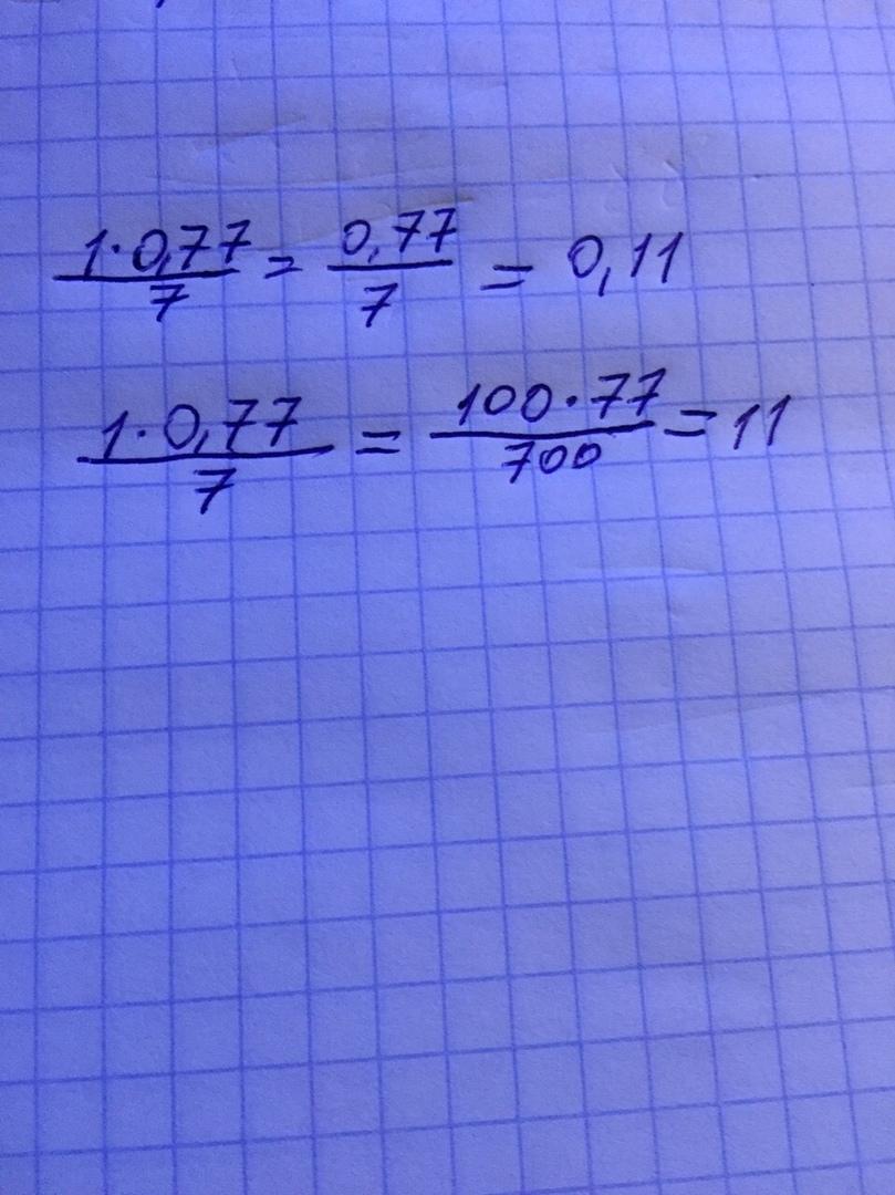 100 * 0,77 / 7 * 100 = 77 / 700 = 0,11.