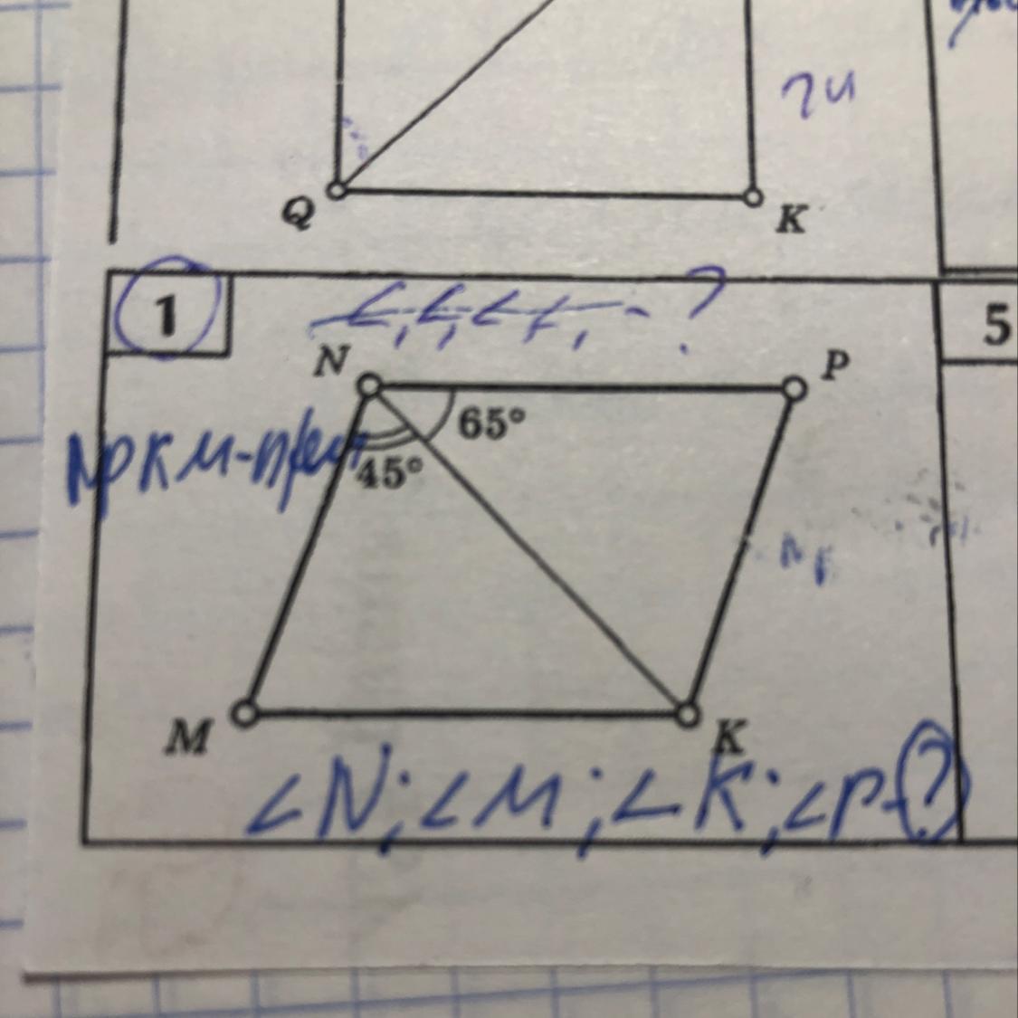 1)т.к NP||MK=> KNP=NKM(накрест лежащие). Т.к. NM|| PK=> MNK=NKP( накрест лежащие). Т.к. угол N =KNP+MNK, а К=NKM+NKP=> К=N=45+65=110. 2)Рассмотрим ∆NKM : MNK=45; NKM=65;=> M=180-65-45=70. 3)Рассмотрим ∆KNP: KNP= 65; NKP= 45=> P= 180- 45-65=70