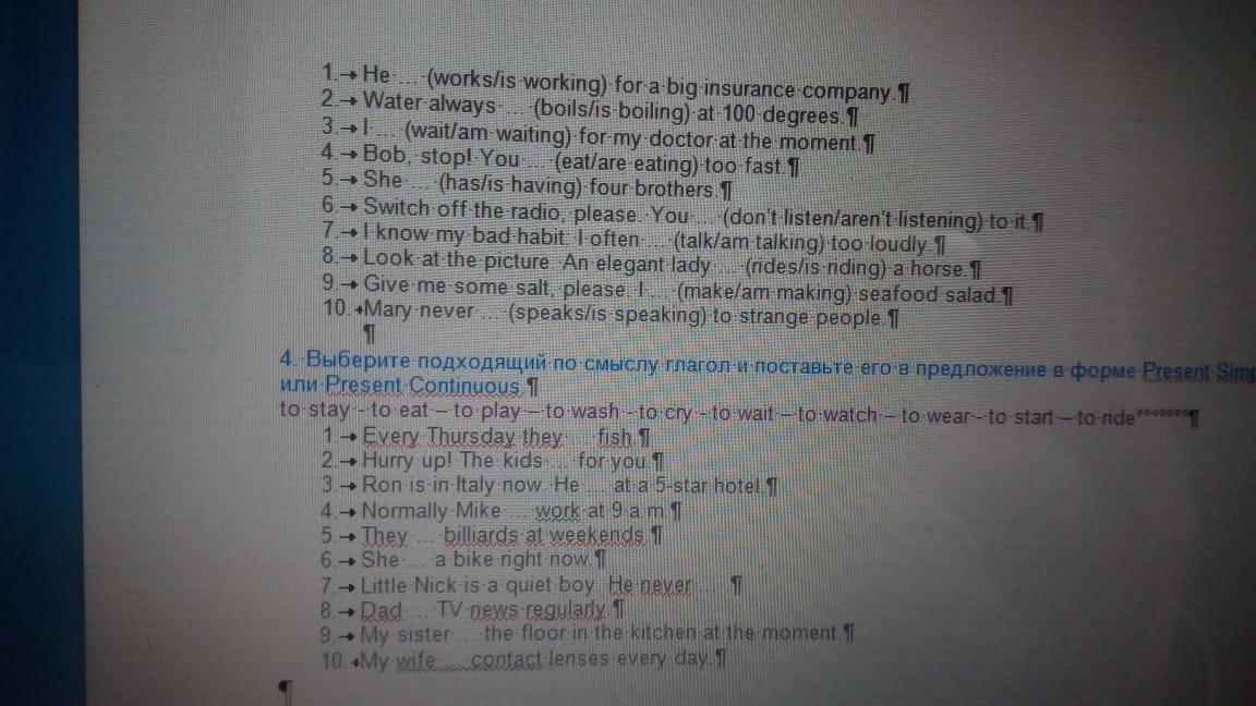 1.works 2.boils 3.am waiting 4.are eating 5.has 6.aren't listening 7.talk 8.is riding 9.am making 10.speaks
