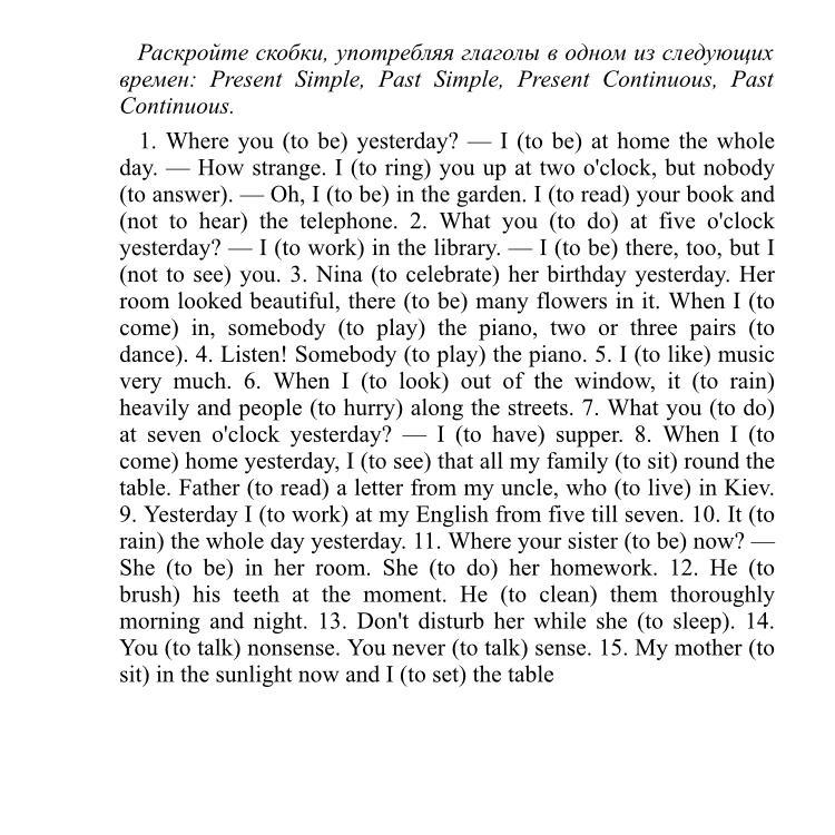 1. Where were you yesterday? I (was) at home the whole day. How strange. I rang you up at two o'clock, but nobody ( answered). Oh, I (was) in the garden. I (was reading) your book and (did not hear) the telephone.