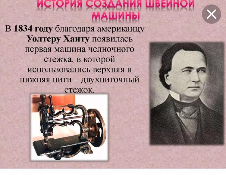 В 1834 году было изобретено челночное устройство швейной машины. Изобрел его Уолтер Хант.