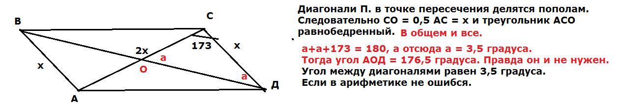 В параллелограмме ABCD диагональ AC в 2 раза больше стороны AB и ∠ACD=173°. Найдите угол между диагоналями параллелограмма. Ответ дайте в градусах.