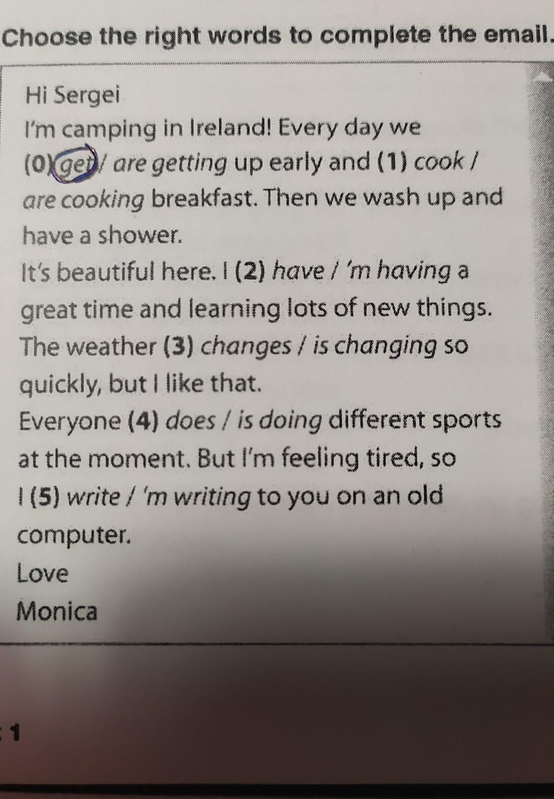 I'm camping in Ireland! Every day we (0) get up early and (1) cook breakfast. Then we wash up and have a shower. It's beautiful here. I (2) 'm having a great time and learning lots of new things. The weather (3) changes so quickly, but I like that. Everyone (4) is doing different sports at the moment. But I'm feeling tired, so I (5) 'm writing to you on an old computer.