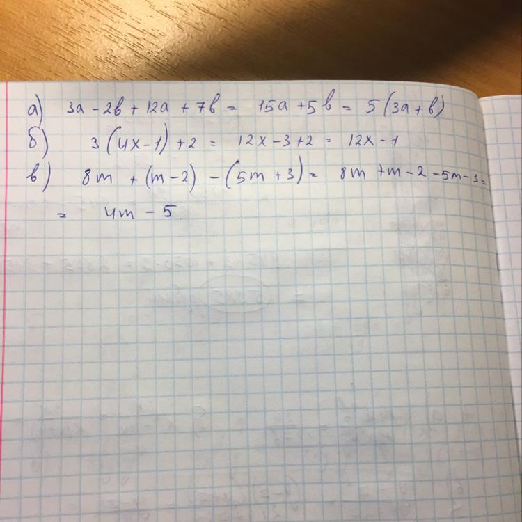 а) 3а-2b+12a+7b= (3+12)a+ (-2+7)b= 15a+5b
