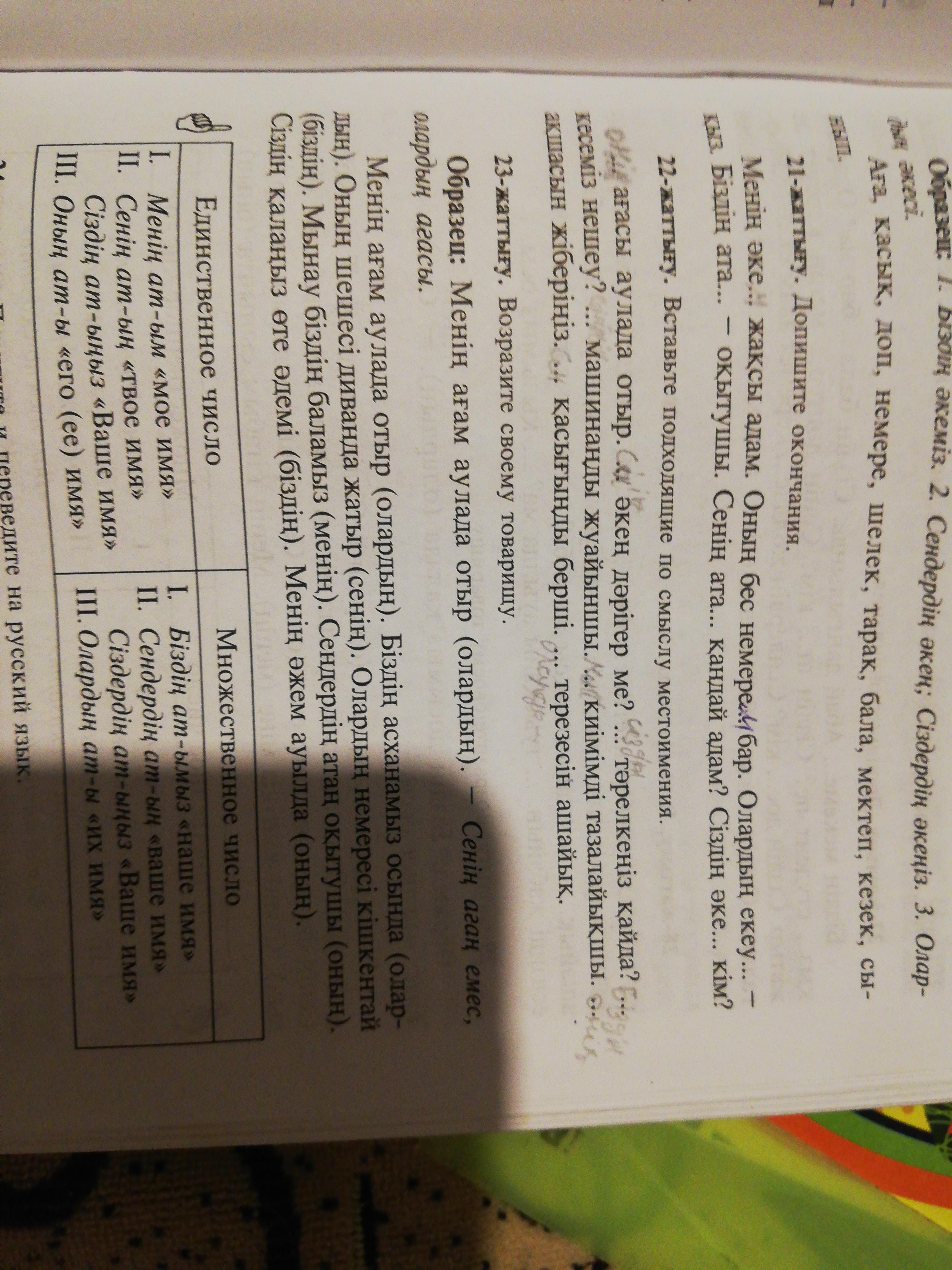 Оның ағасы аулада отыр.Сенің əкең дəрігер ме? Сіздің тəрелкеңіз қайда?