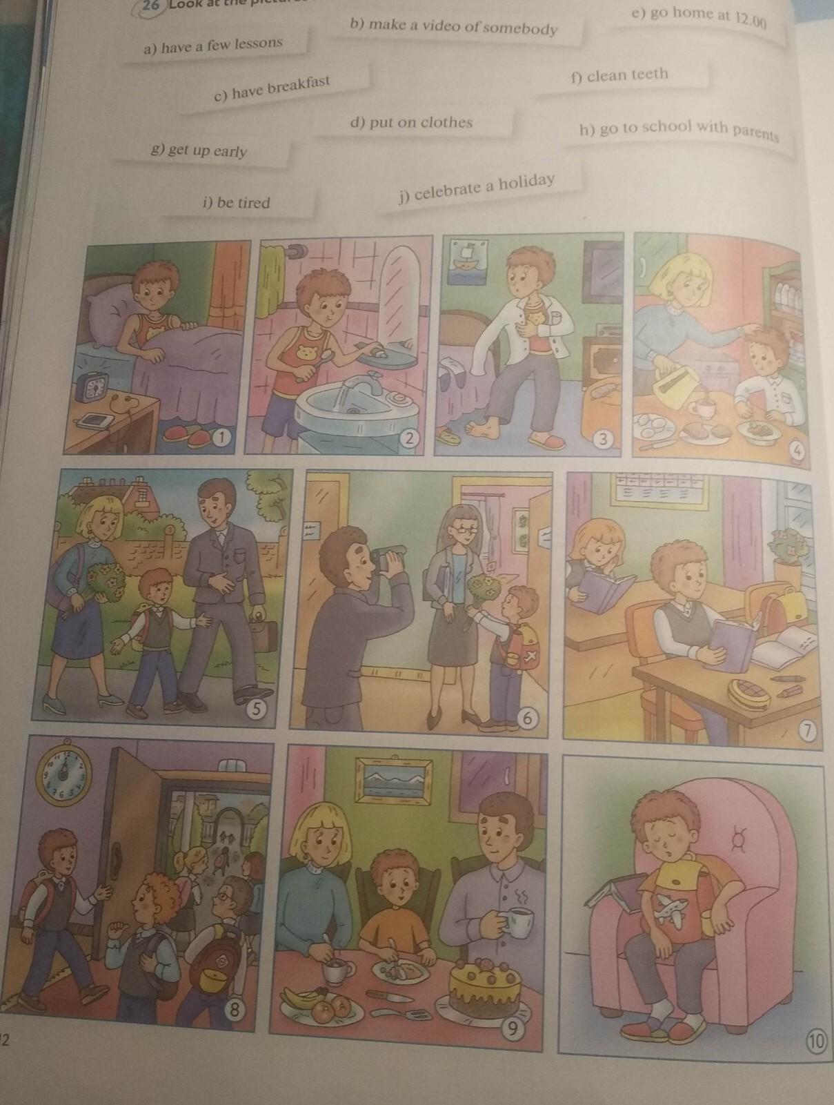 Mark got up early. He cleaned teeth, put on clothes and then he had a breakfast. Then Mark went to school with his parents, made a video and had a few lessons. Mark went home at 12 pm. At the evening he celebrated a holiday with his family. Mark was tired.