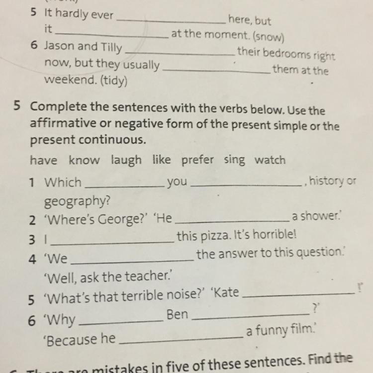 5 Complete the sentences with the verbs below. Use the affirmative or negative form of the present simple or the present continuous.