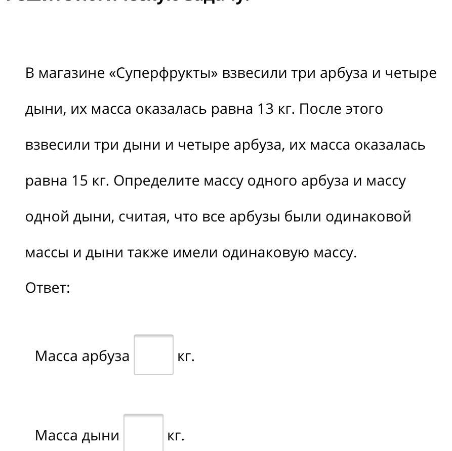Ответ: 3 кг - весит каждый арбуз, 1 кг - весит каждая дыня.