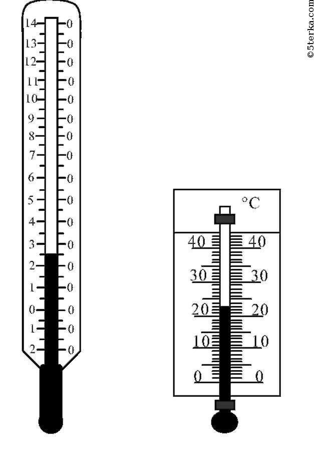 Как видно на первом термометре(рис.1) мы можем посчитать цену деления, для этого возьмем 1 и 0(расстояние между двумя ближайшими штрихами, можно взять два любых других ближайших чисел)
