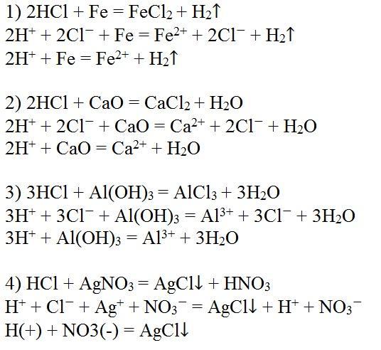 С какими из перечисленных веществ реагирует соляная кислота:азот,железо,оксид кальция,серная кислота,гидроксид алюминия,сульфат натрия,нитрат серебра.Напишите уравнения возможных реакций в молекулярной и ионной формах
