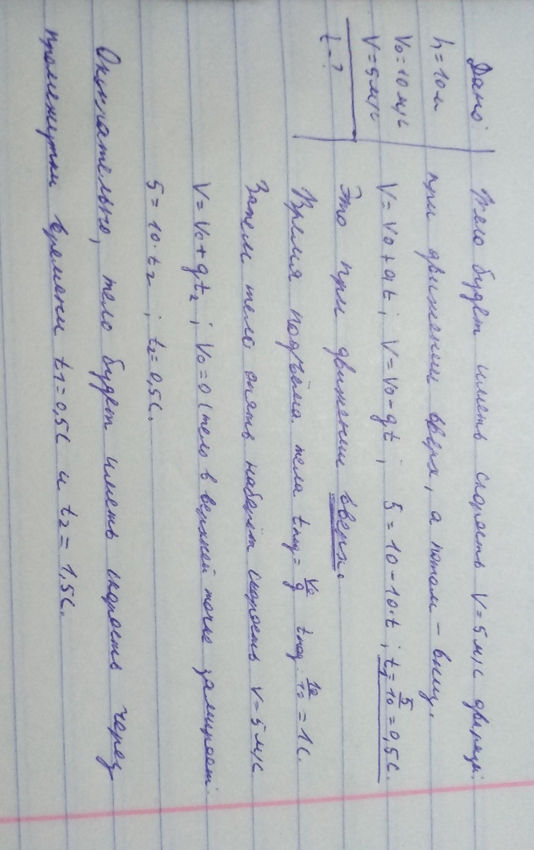Тело брошено вертикально вверх на высоте 10м с начальной скоростью 10 м/с .Через какое время его скорость станет 5 м/с?