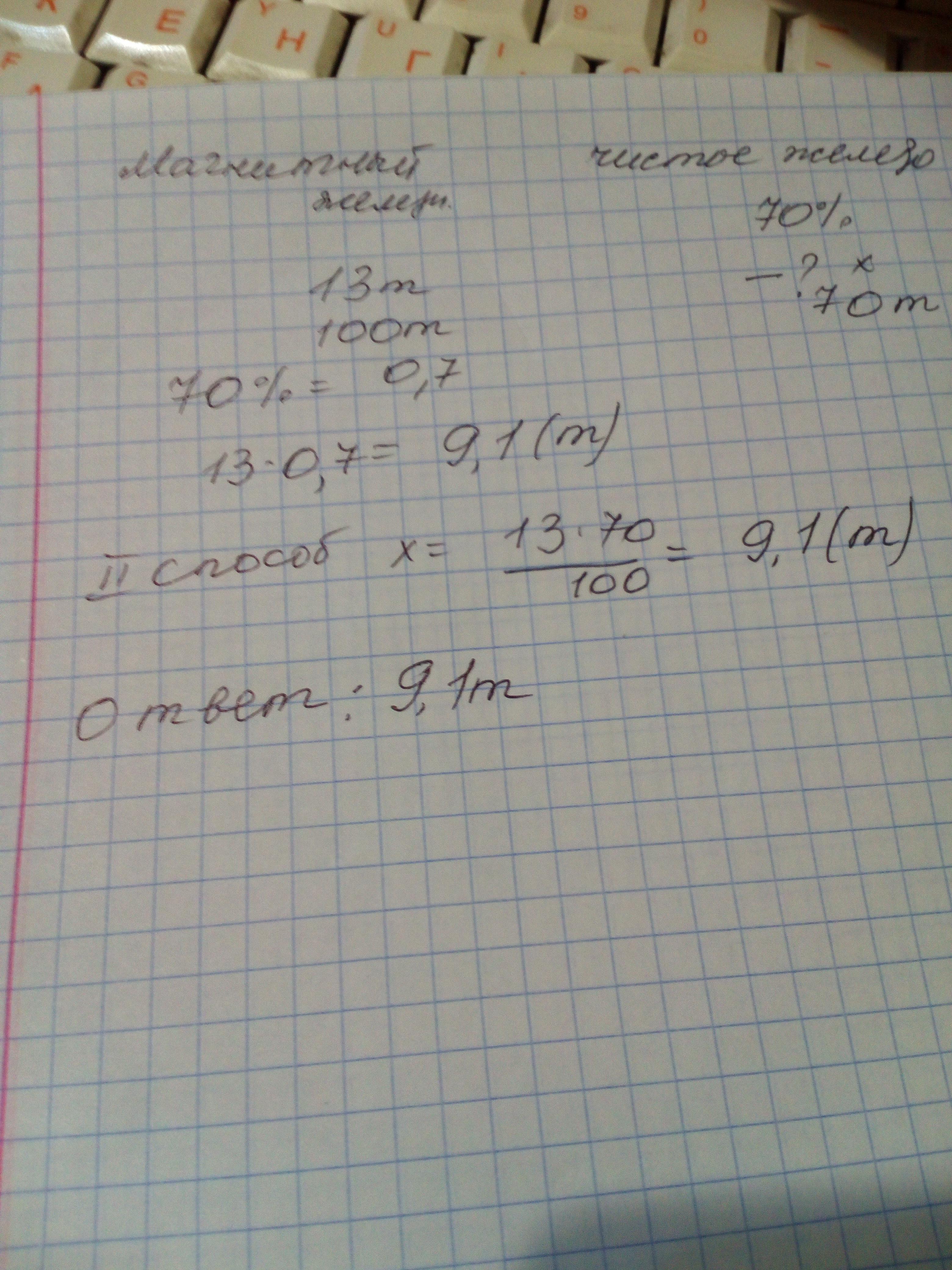 Магнитный железняк содержит 70% чистого железа. Сколько тонн чистого железа содержится в 13 т магнитного железняка? С краткой записью 95 баллов