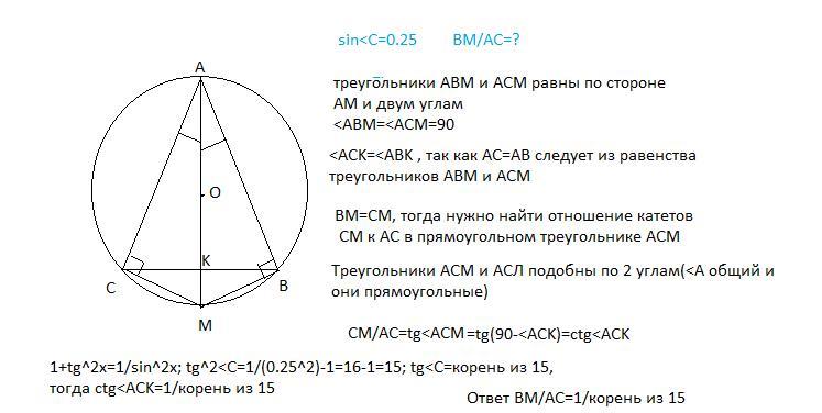 Диаметр АМ окружности описанной около треугольника АВС делит угол А пополам. Синус угла С равен 0,25. Чему равно отношение ВМ:АС?