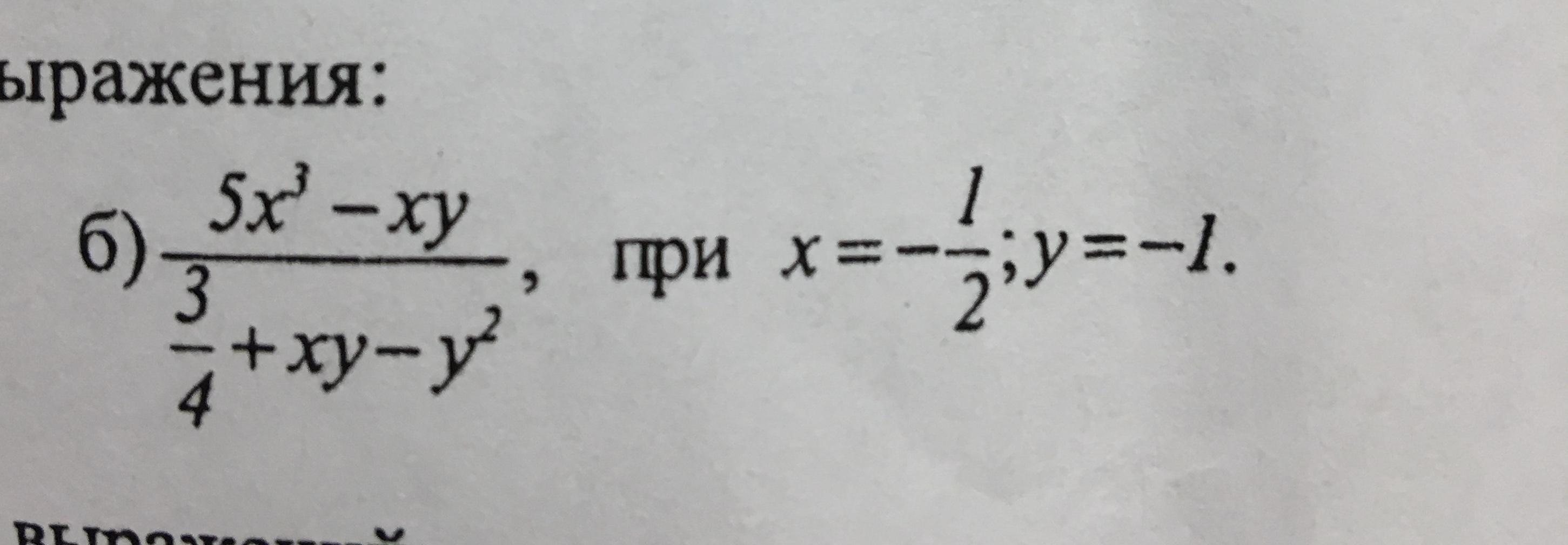 (5x³-xy)/(3/4 +xy-y²)=x(5x²-y)/(3/4 +y(x-y))=(-1/2(5·(-1/2)² -(-1))/(3/4 +(-1)·(-1/2 -(-1))=(-1/2·(5/4 +4/4))/(3/4 -(-1/2+2/2))=(-1/2 ·9/4)/(3/4-1/2)=(-9/8)/(3/4 -2/4)=(-9/8)/(1/4)=(-9·4)/8=-9/2=-4,5
